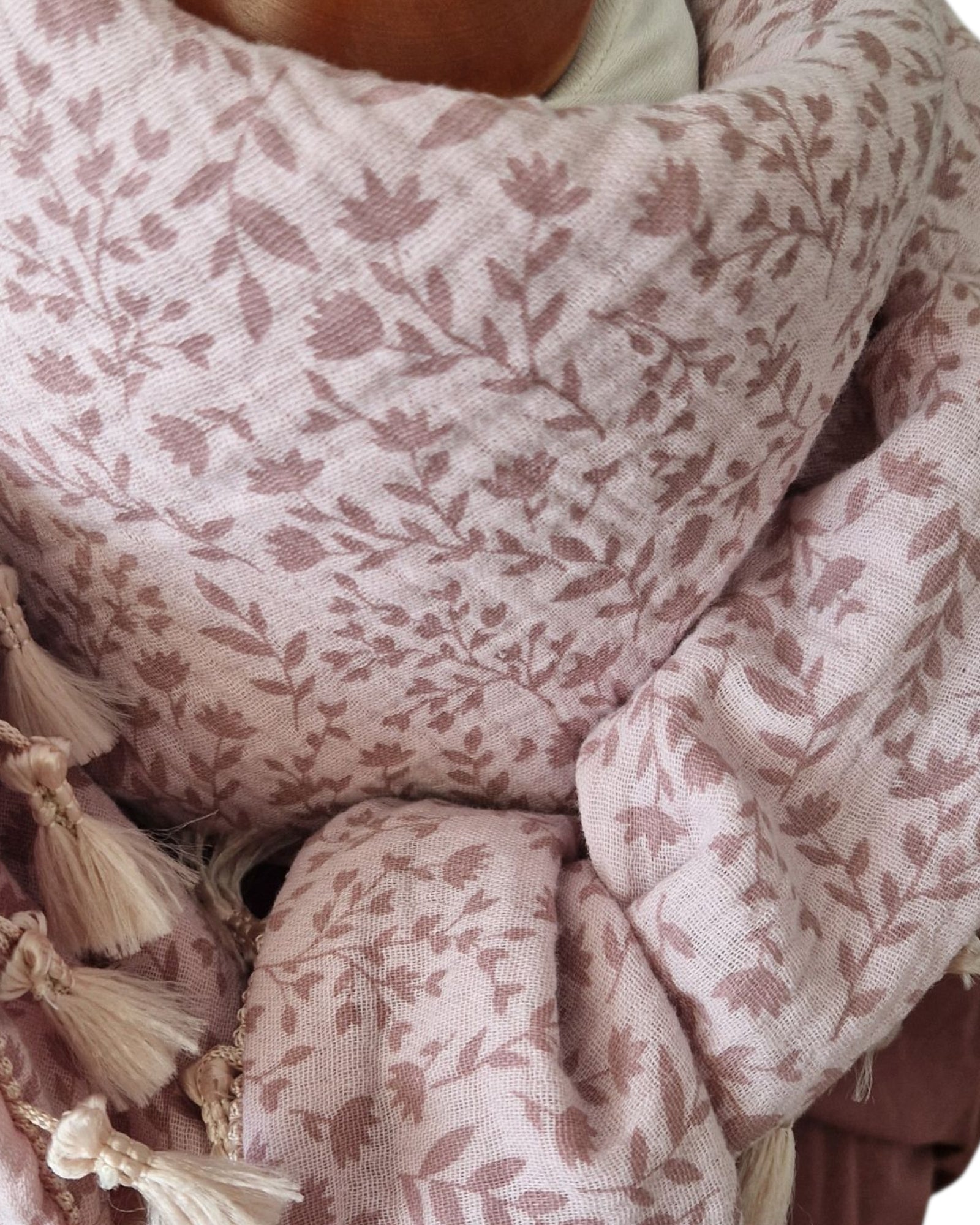 Sehrschöne Musselinschal in Dreiecksform, doppeltgenäht aus 100 % BW, Oeko-Tex Standard geprüfter Stoff, in altrosa hell mit kleinen Blumen. Quastenborte Borte in sand.