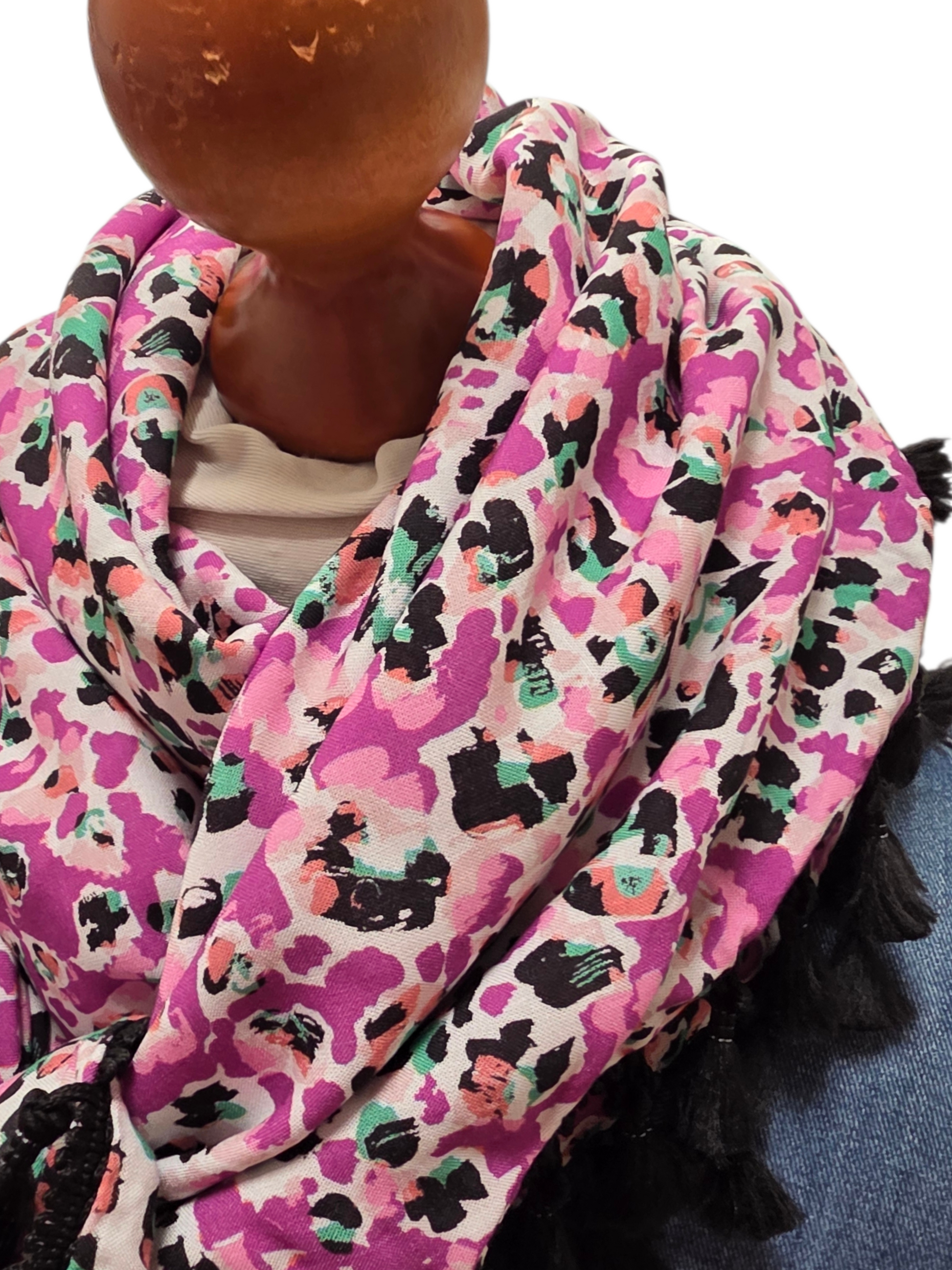 Elegantes Dreieckstuch, doppelgenäht, aus fließender Viskose mit angesagtem Leoparden-Muster in den Farbtönen Grün, Schwarz und Pink. Die schwarze Quastenborte verleiht dem Accessoire einen raffinierten Abschluss. Das locker fallende, fein verarbeitete Tuch besticht durch seine Vielseitigkeit . Dank der modernen Farbkombination und des zeitlosen Musters ein echter Hingucker, der bereits auch im Frühling zu leichten Outfits kombiniert werden kann. Ein Must-have für jeden Kleiderschrank.
