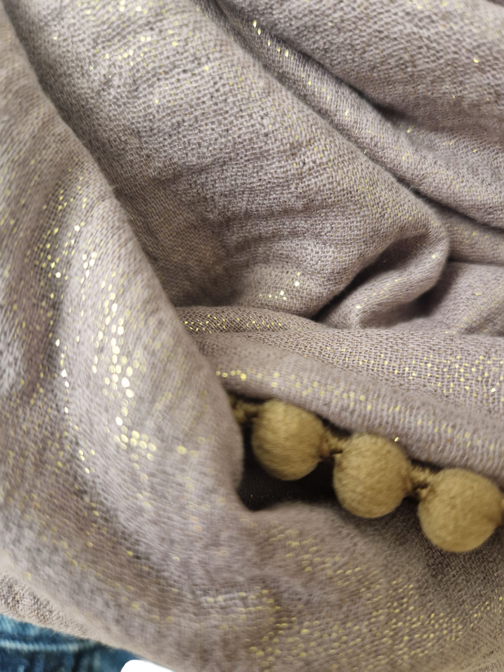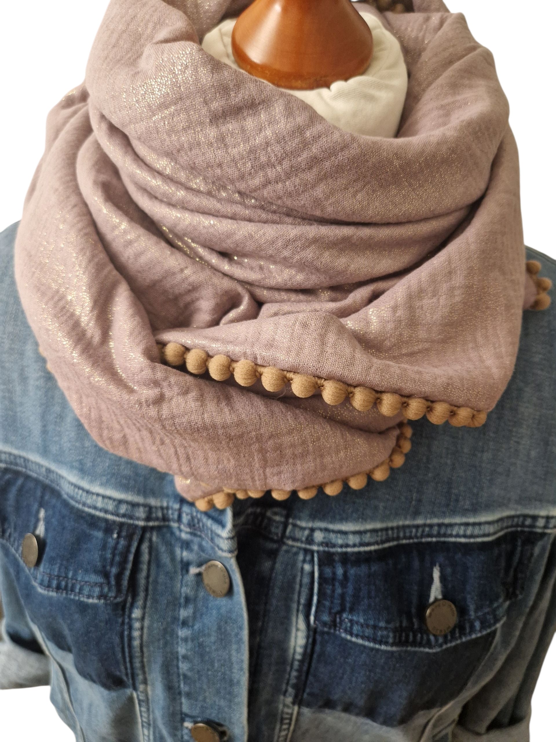 Dreieckstuch in 100 % Musselinstoff in Mauve mit Glitzer, doppelgenäht. Sehr angenehm zum tragen, Borten in Goldbraun. Stoff ist 100% Baumwolle. Übrigens der Schal ist ein ganzes Jahres Tuch.