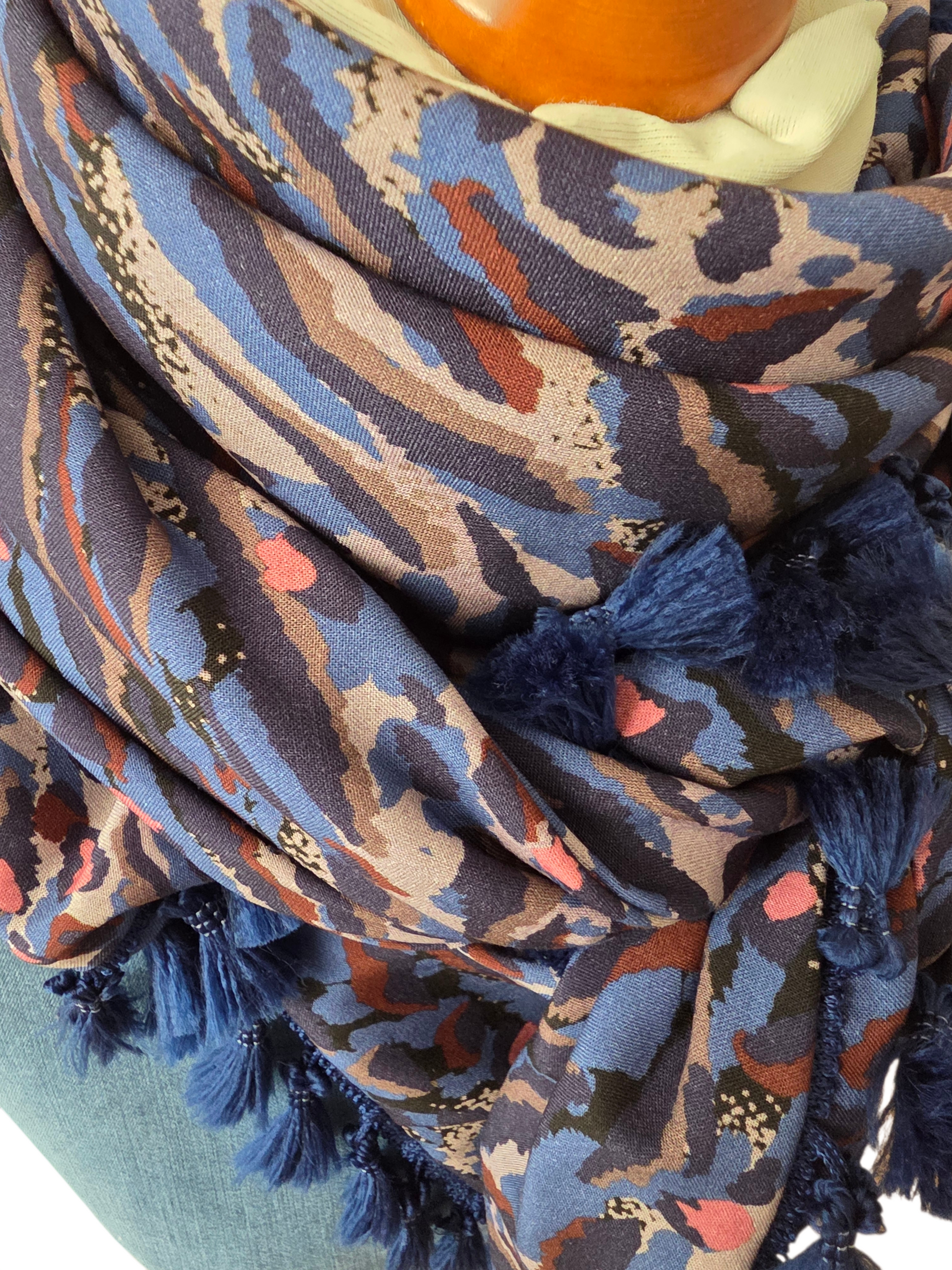 Das Dreieckstuch Damen Bettina besteht aus 100 % feinem Viskosestoff und überzeugt durch seine geometrischen Muster in Blau und Beige und rosa. Es bietet vielseitige Trageoptionen, eignet sich sowohl für legere als auch für elegante Anlässe und gewährleistet einen angenehmen Tragekomfort dank seiner weichen Fallstruktur. Quastenborte in Blau.