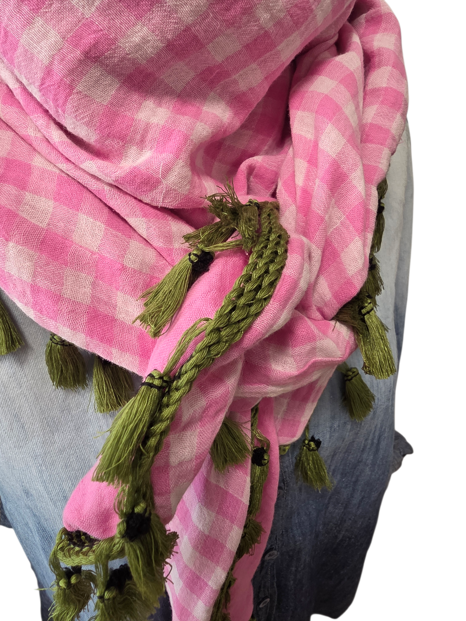 Dieses wunderbare Dreieckstuch ist ein echtes Statement-Piece! Gefertigt aus 100% weicher, feiner Baumwollmusselin besticht es mit seinem charmanten Rosa-Weiß-Karomuster auf der einen Seite und eleganter Unifläche auf der anderen. Die kontrast farbige Quastenborte in kräftige olivegrün setzt den perfekten Akzent und macht dieses Accessoire zum absoluten Hingucker. Vielseitig kombinierbar und angenehm zu tragen – ein Must-have für jeden Stil!