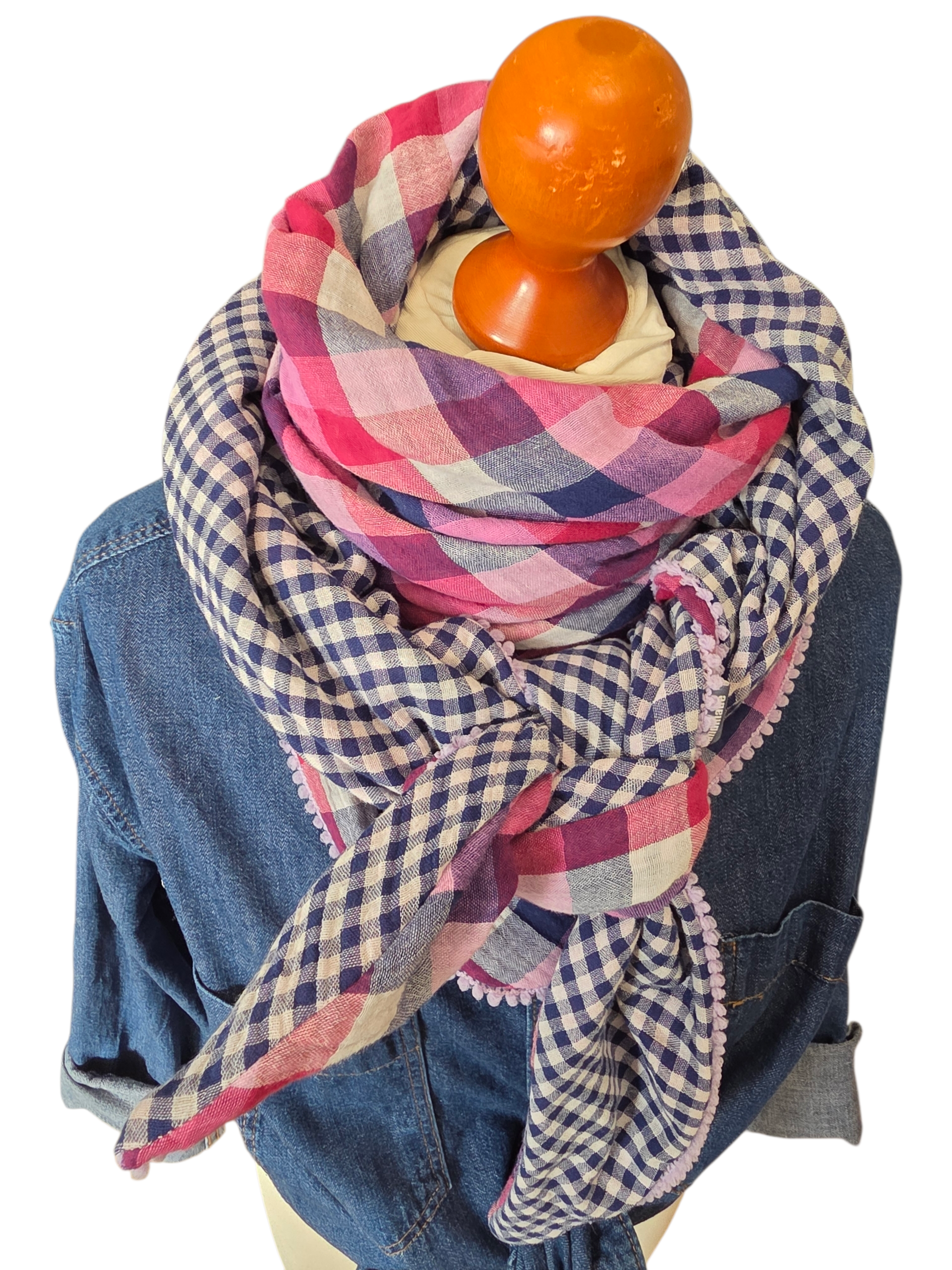 Das Dreieckstuch Celeste ist ein Musselinschal aus 100 % Baumwolle in rosa, beeren, marineblau, hellgrau, lila in einem schönen Karomuster. Die eine Seite ist mit farbigen, größeren Karos versehen, während die andere Seite mit kleinen Karos verziert ist. Genießen Sie das schöne Musterspiel und halten Sie sich dabei warm und stylisch. Kleine Borte in lila.
