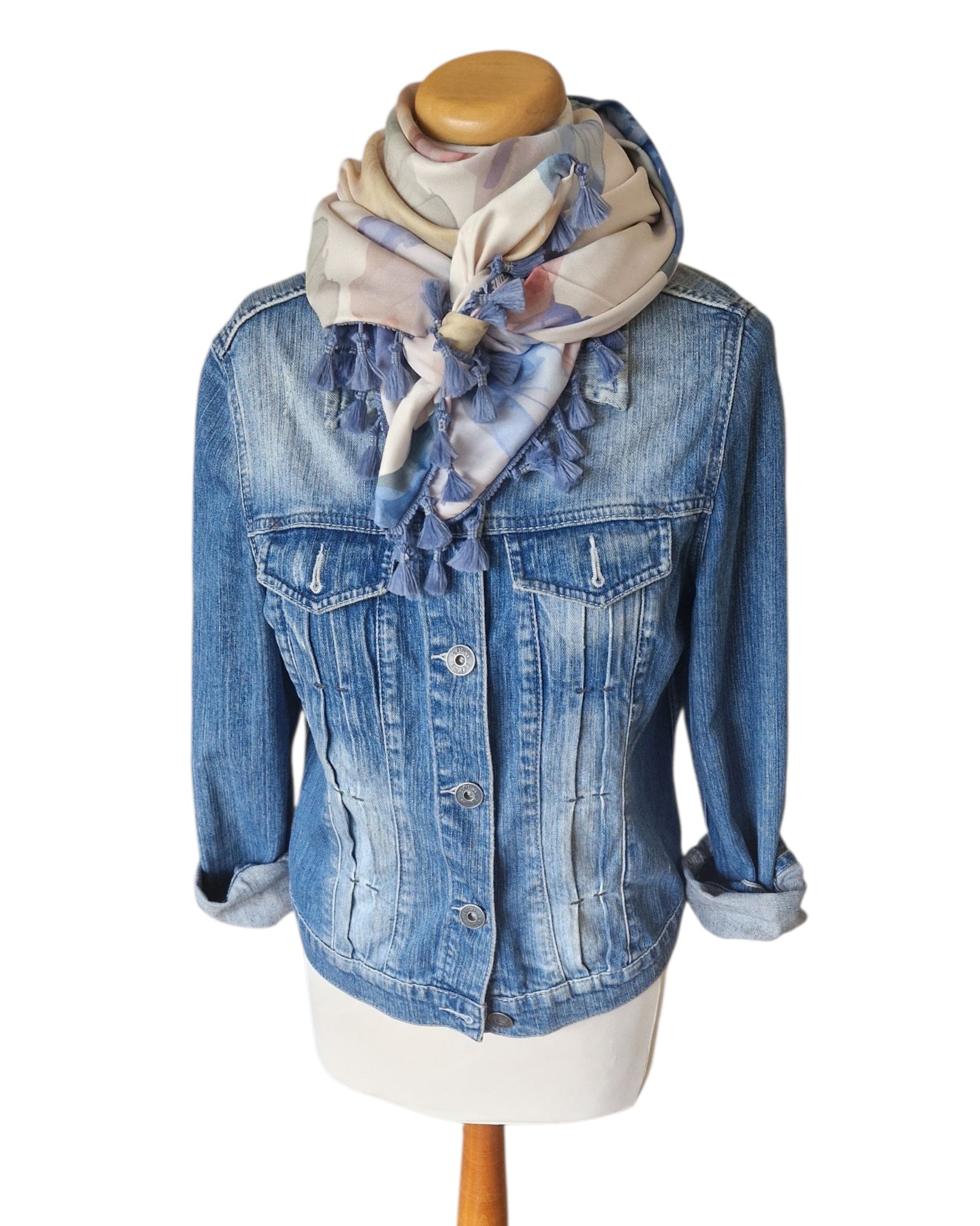 Dreieckstuch doppeltgenäht in wunderschönen, seidenähnliche 100 % Twill-Viskose. Der Stoff ist aus dem Hause Light & Lush. Light & Lush ist inspiriert von der Einfachheit der Natur. Die Stoffe verbinden leichte Texturen mit eleganten Designs. Oeko-Tex geprüfter Stoff. Quastenborte in Taubenblau.