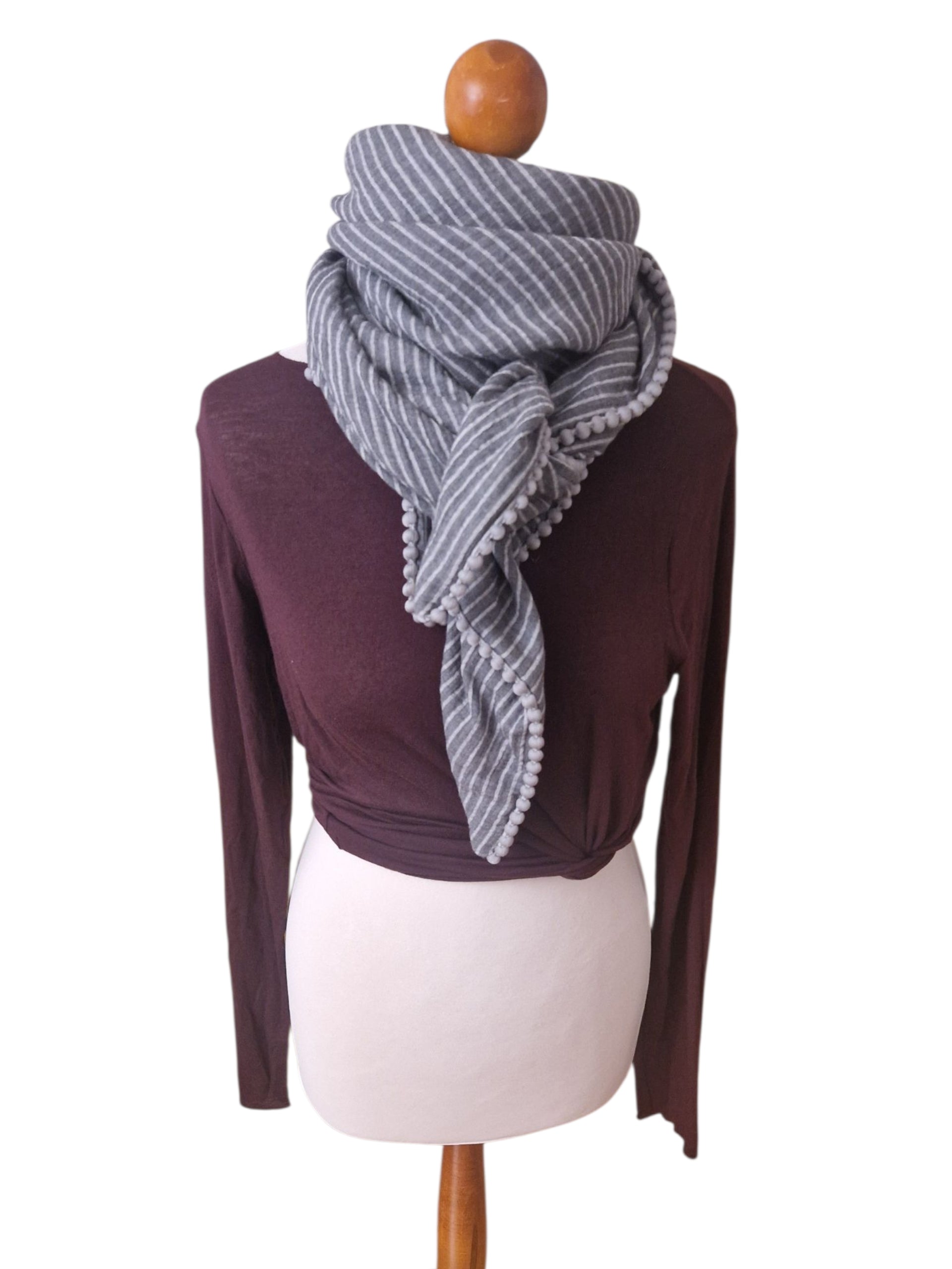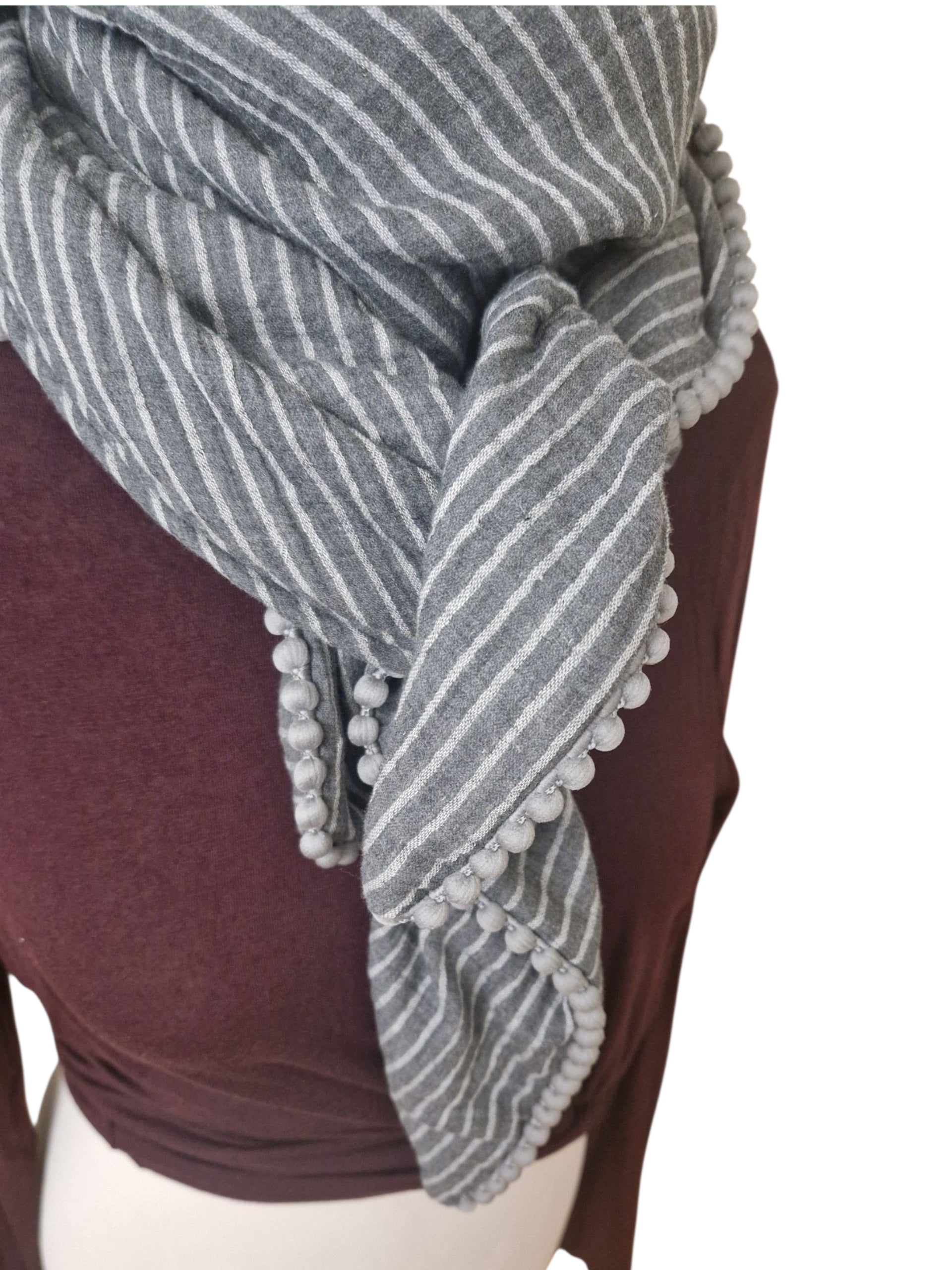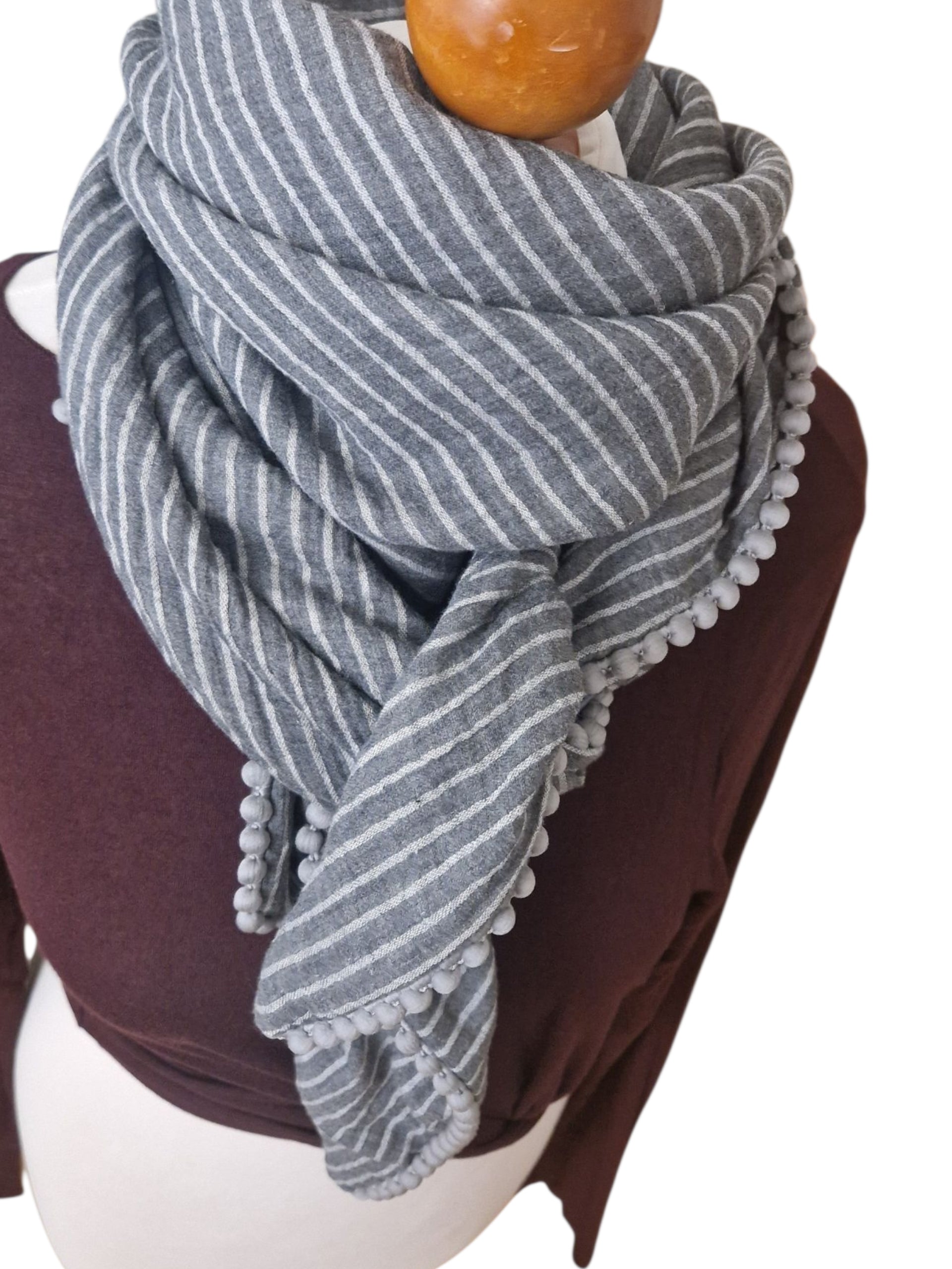 Wunderschöner Dreieckstuch in 100% Musselinstoff, Baumwolle 100% . Doppeltgenäht. Streifenmuster, schwarz-hellgrau. Extrem weich und leicht. Borte in hellgrau