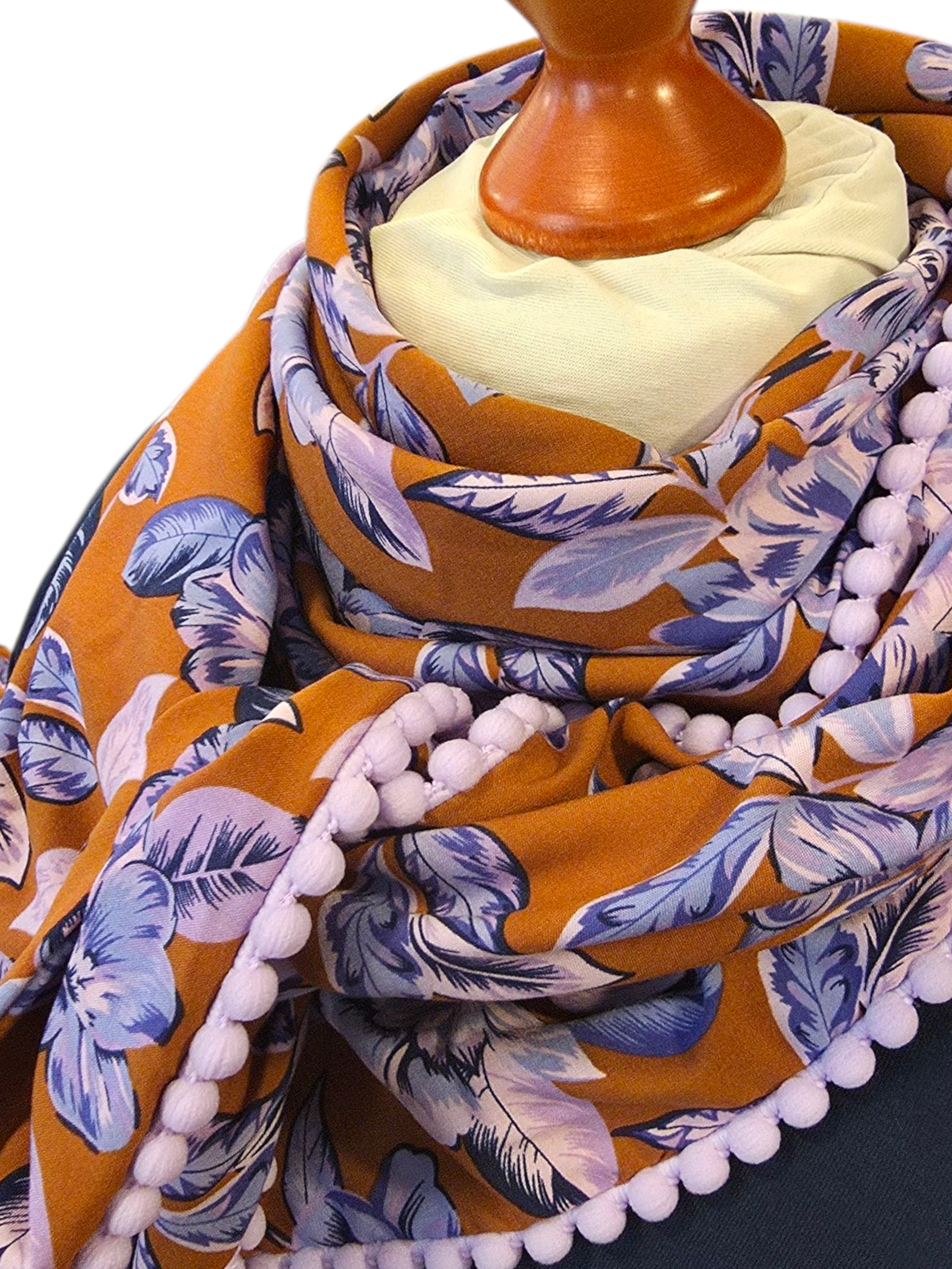 Sehr schönes Dreieckstuch in 100 % Twill - Viskose, in caramell mit Lila-Blumen. Borten in Lila. Eine tolle Farbkombination, die das Outfit sehr aufpeppt.
