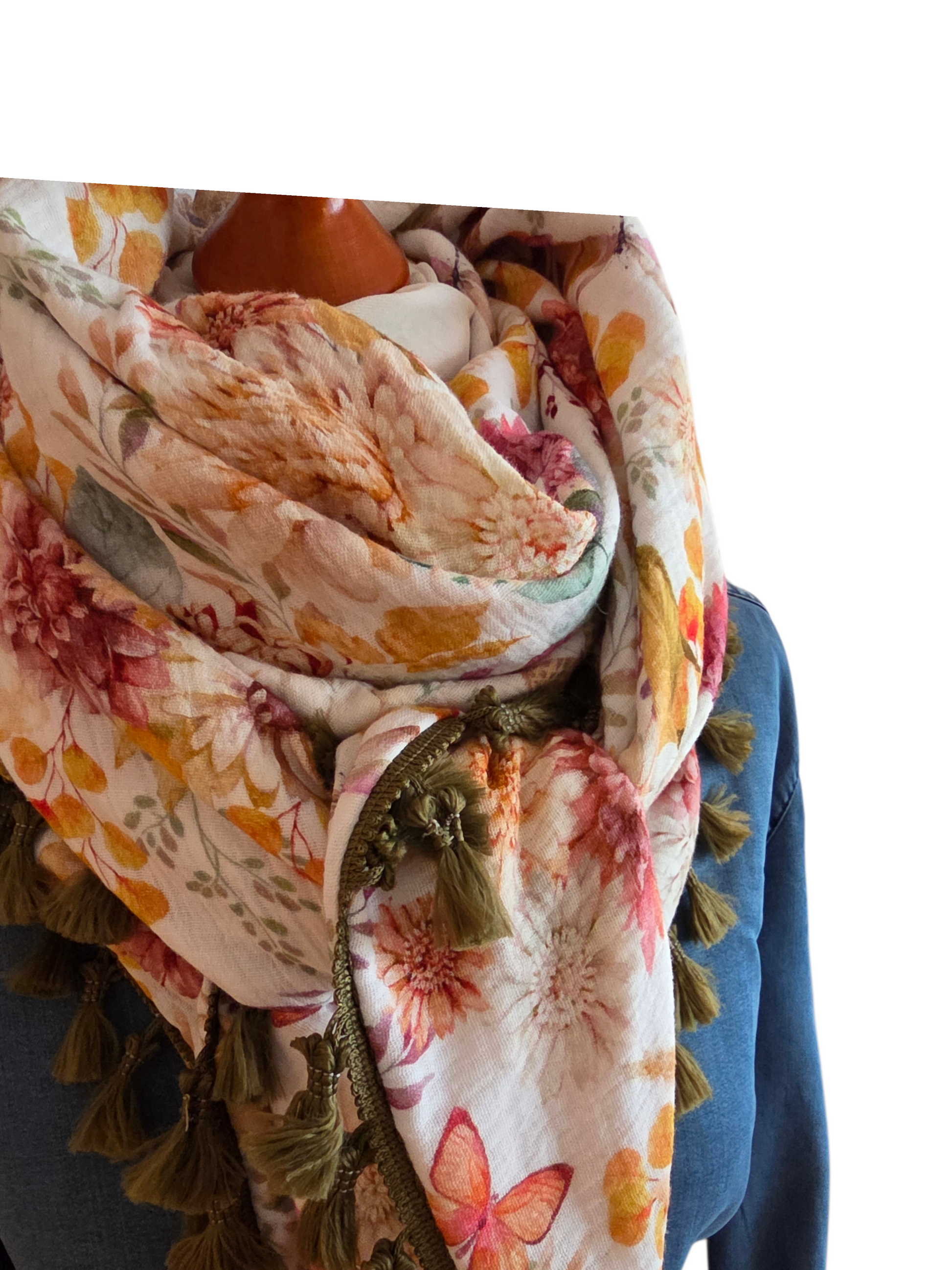 Zartes Musselintuch Sylvie mit zauberhaften Blüten, Schmetterlingen und Libellen in sanften Herbsttönen. Das Dreieckstuch schmiegt sich angenehm an die Schultern und bietet vielseitige Styling-Möglichkeiten. Die feine Musselin-Qualität garantiert höchsten Tragekomfort und Atmungsaktivität. Ein Accessoire für jeden Tag, das Ihre Garderobe mit natürlicher Schönheit bereichert. Quastenborte in Olivegrün