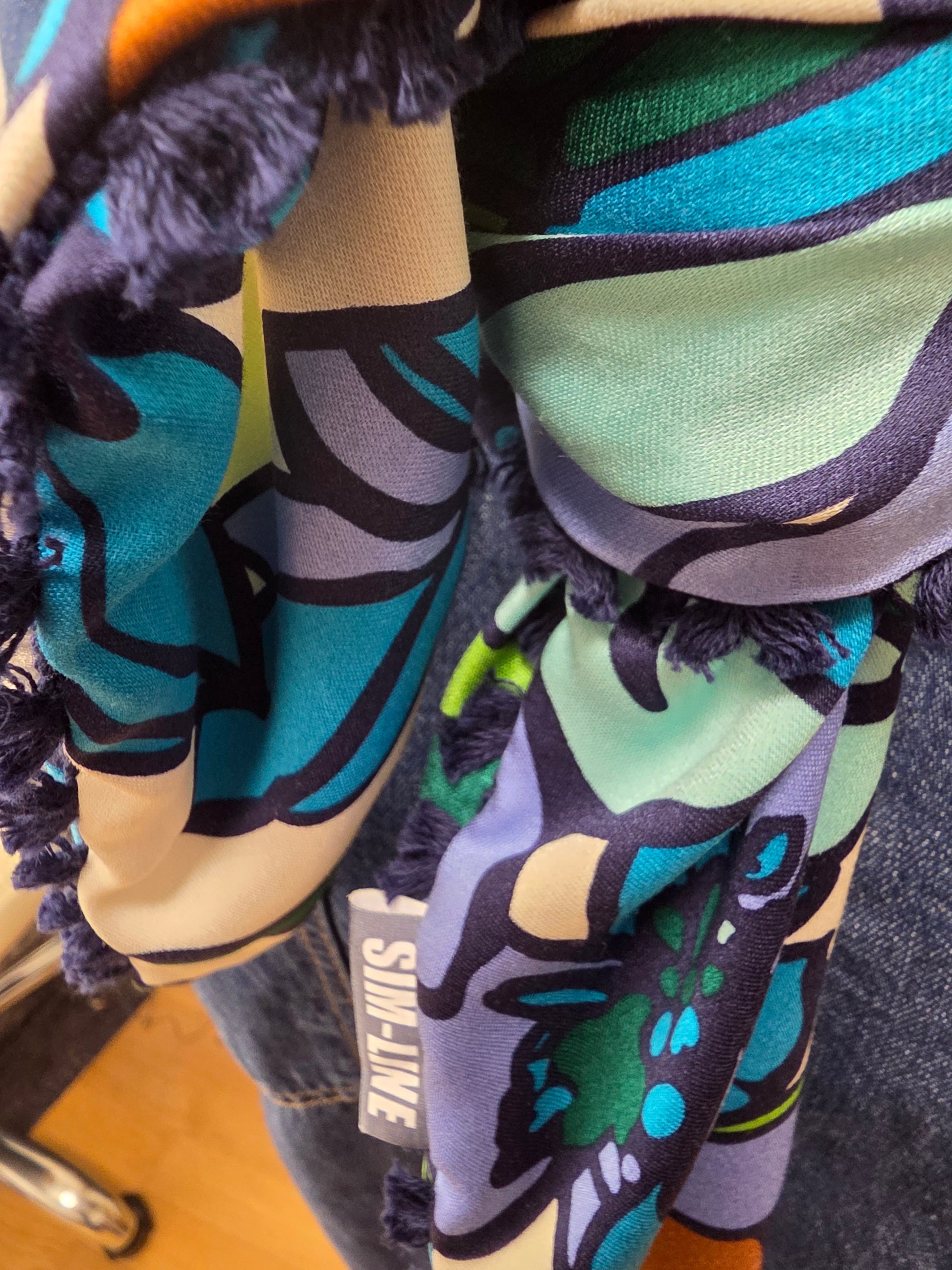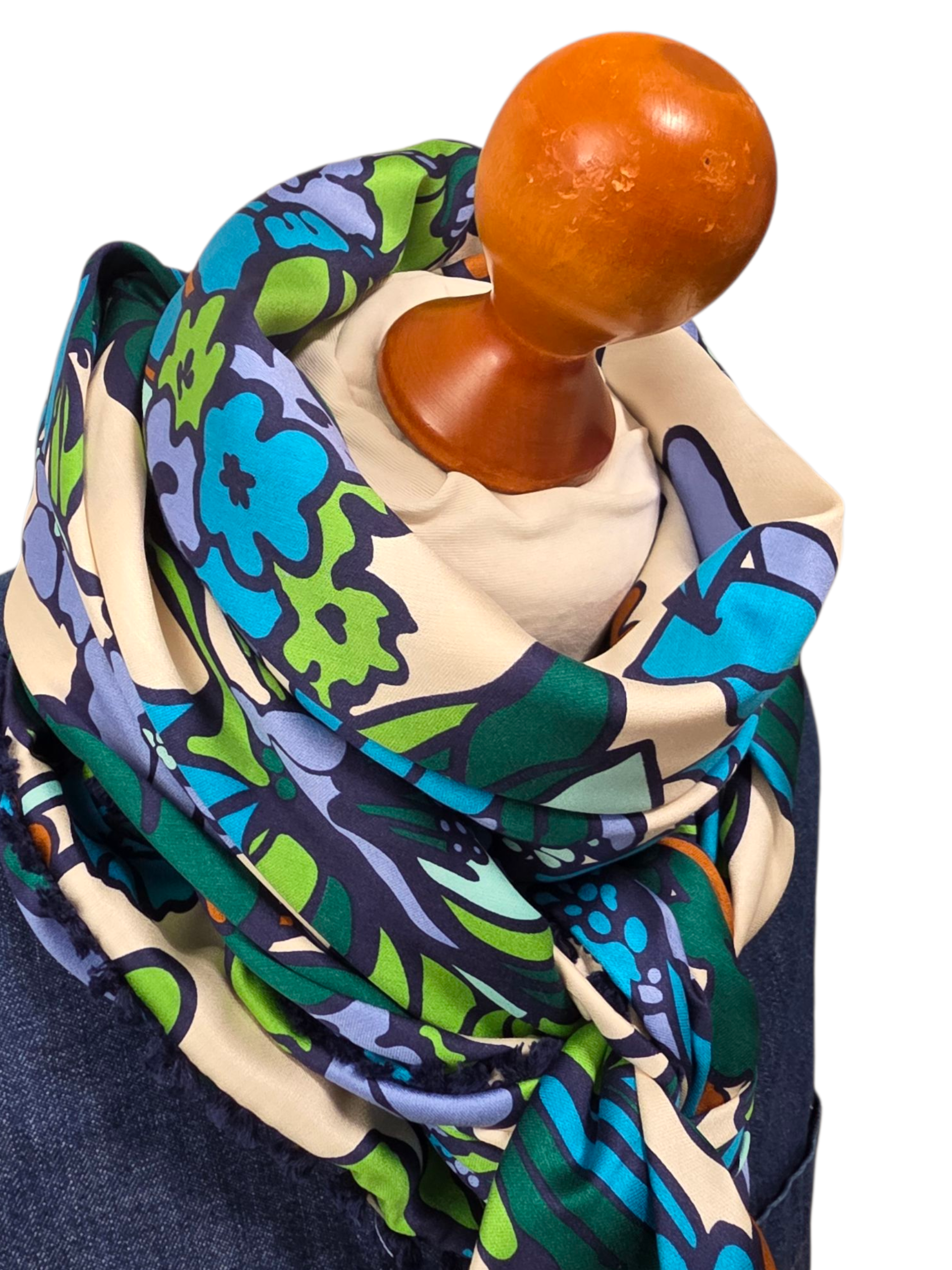 Dieses Dreieckstuch ist aus 100 % Viskose-Satin gefertigt und besticht durch seine elegante Optik. Die Mischung aus Blumen und den schönen Farben in Grüntönen, Blau, Türkis, Lila, Braun und Offwhite gibt dem Tuch eine besonders ansprechende Farbkombination. Das Material fühlt sich zudem angenehm wie Seide an. Kleine Quastenborte in marineblau.