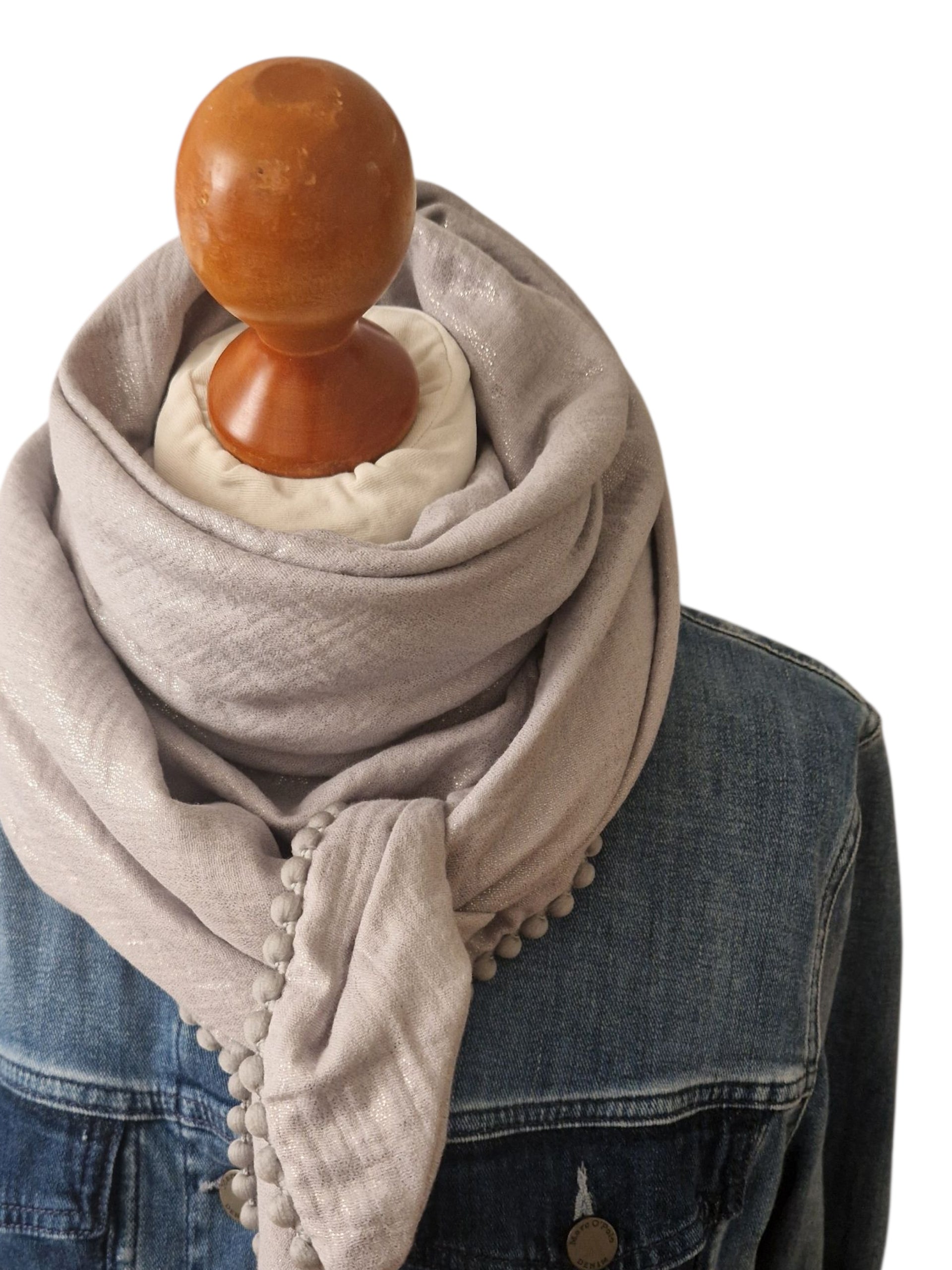 Dreieckstuch in 100 % Musselinstoff in Silber hellgrau mit Glitzer, doppelgenäht, eine Seite ohne Glitzer. Sehr angenehm zum tragen, Borten in hellgrau. Stoff ist 100% Baumwolle. Übrigens der Schal ist ein ganzes Jahres Tuch.