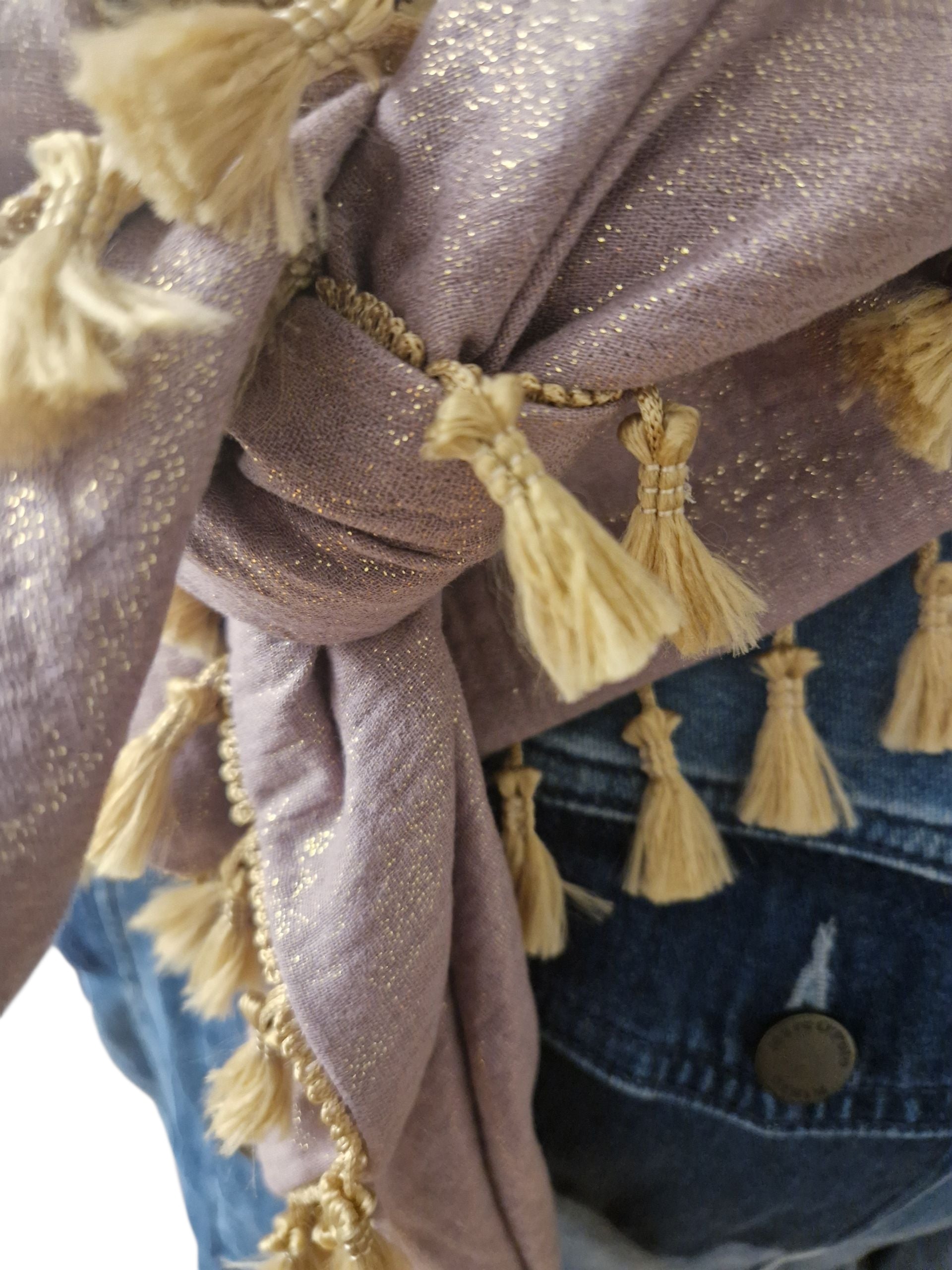 Dreieckstuch in 100 % Musselinstoff in Mauve mit Glitzer, doppelgenäht. Sehr angenehm zum tragen, Borten in Goldbraun. Stoff ist 100% Baumwolle. Übrigens der Schal ist ein ganzes Jahres Tuch.