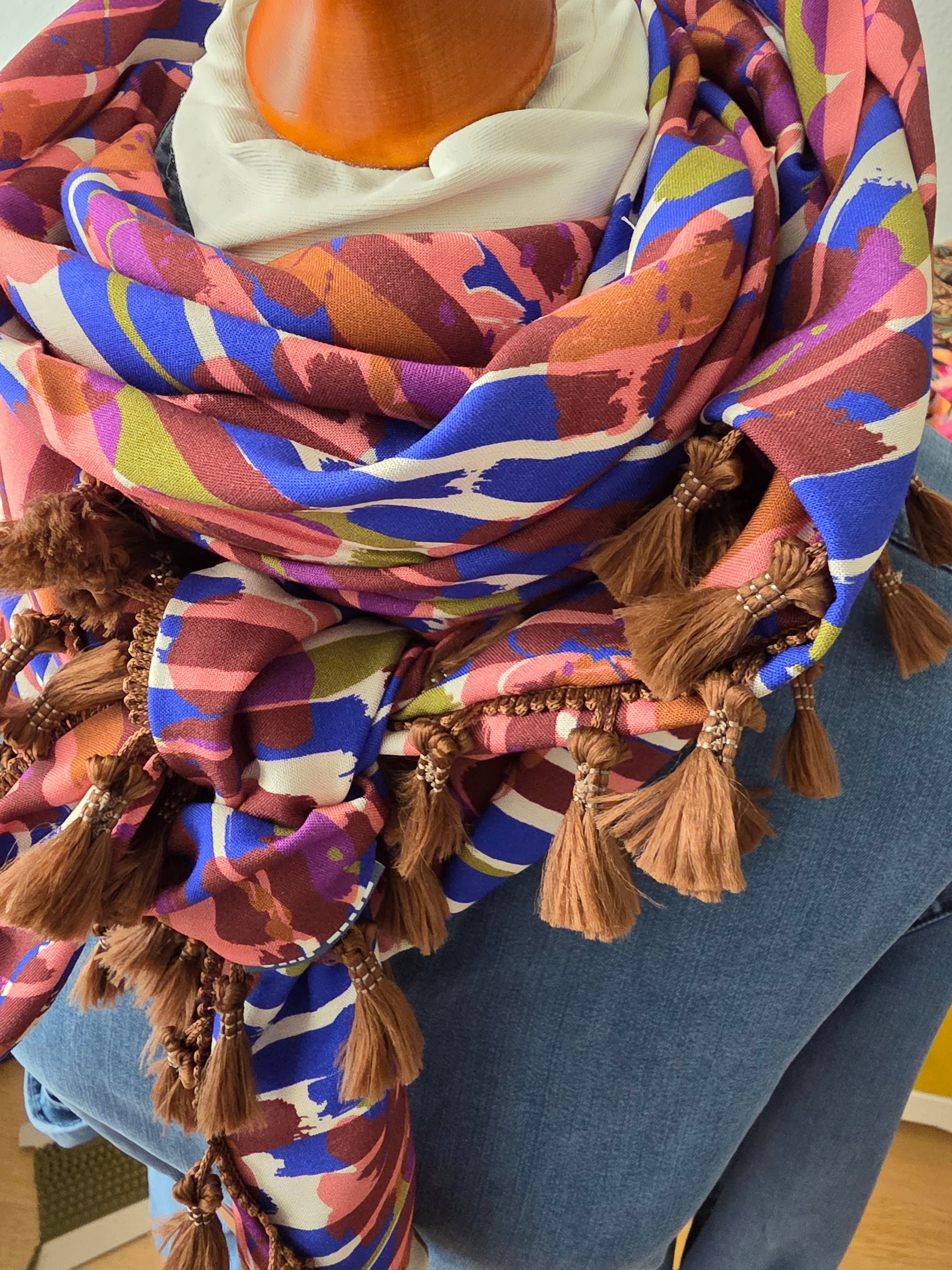 Das Dreieckstuch Damen Siria kombiniert stilvolle Farben wie royalblau, braun, offwhite, grün, pink und peach mit einem eleganten abstrakten Blumenmuster. Der feine Viskosestoff bietet einen angenehmen Tragekomfort, während die doppeltgenähte Borte Stabilität gewährleistet. Ideal für vielseitige Outfits. Quastenborte in braun.