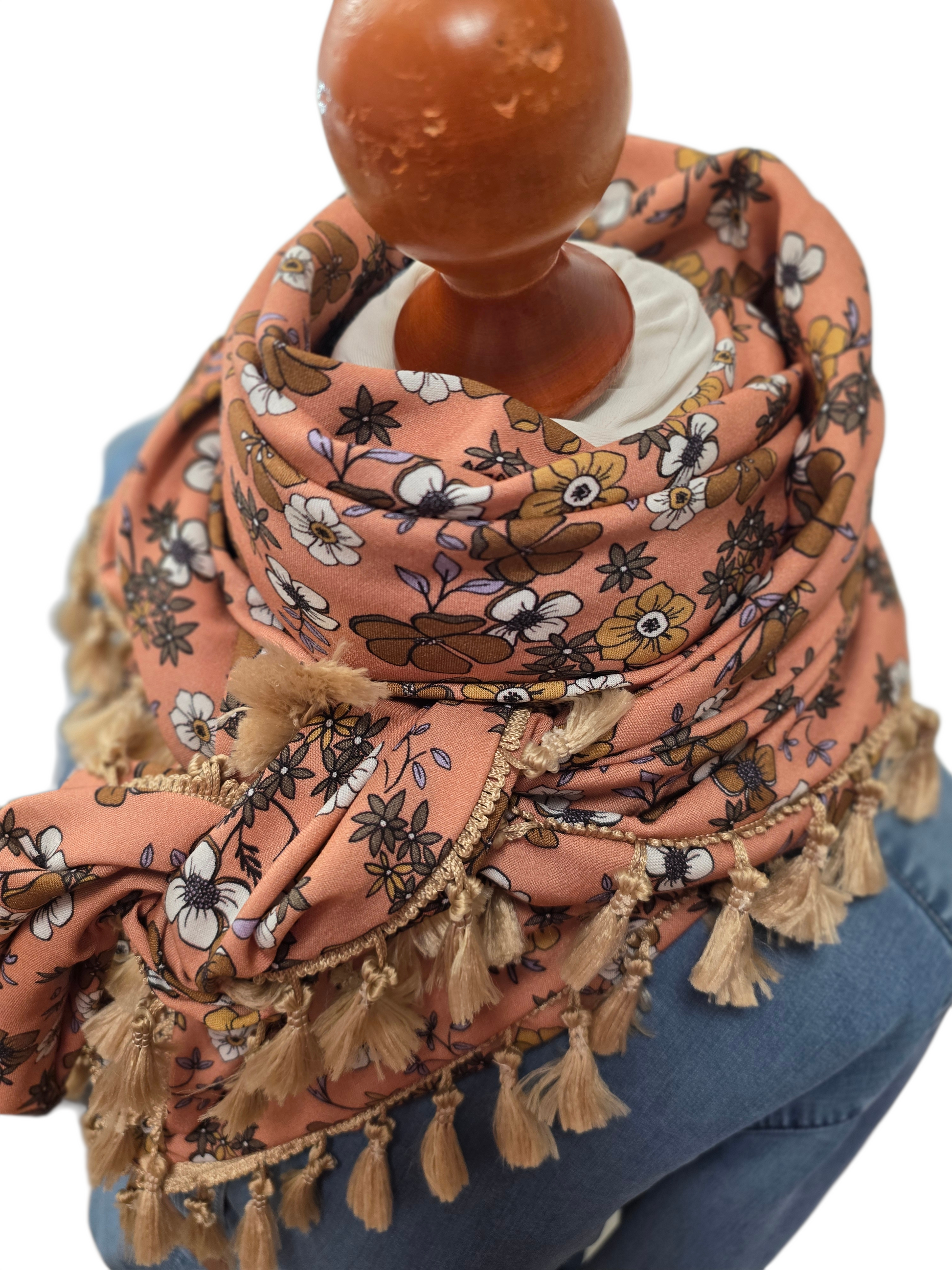 Elegantes Dreieckstuch, doppeltgenäht, aus seidenartigem Viskosestoff mit fließendem Fall. Das Accessoire besticht durch ein harmonisches Farbspiel aus verschiedenen Brauntönen, zartem Blassorange und tiefem Lila, ergänzt durch weiße Akzente. Die hochwertige Quastenborte in Goldbraun verleiht dem Tuch eine raffinierte Verarbeitung und zusätzliche Struktur. Ideal als vielseitiger Begleiter für verschiedene Anlässe – ob elegant drapiert oder klassisch gebunden. Ein zeitloses Stück, das Ihre Garderobe mit Farbe und Textur bereichert.