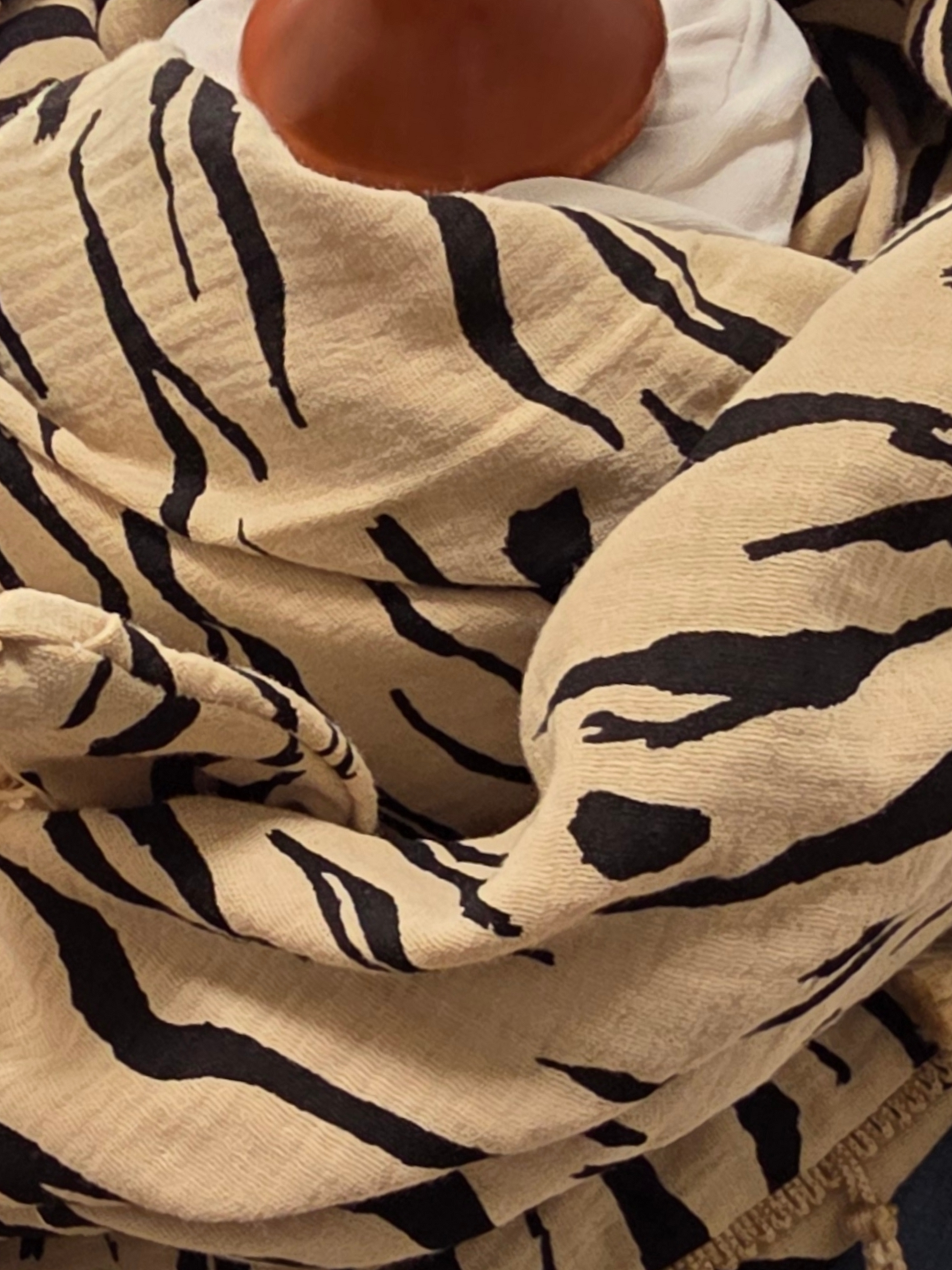 Musselintuch in 100% Baumwolle in tollen Zebramuster schwarz und beige, mit kleinen Quastenborte in goldbraun.