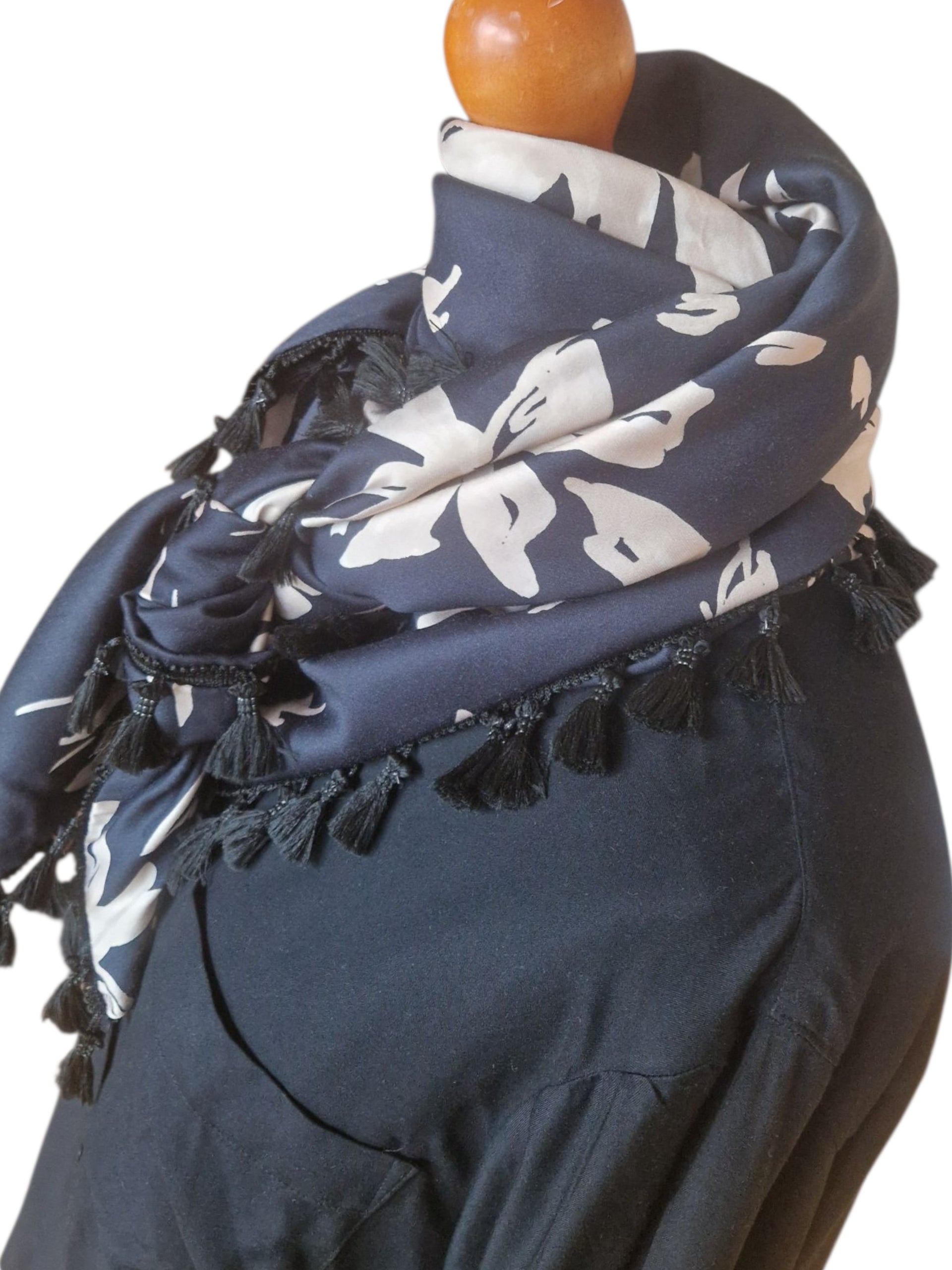 Ein elegantes Dreieckstuch, doppelt genäht, aus 100% hochwertigem Viskose-Satin, in Schwarz mit beigen Blumen. Ein sehr schöner Schal mit einer Quastenborte in Schwarz. Der Schal lässt sich hervorragend zu einer Lederjacke tragen. Ein echter Hingucker – auch ideal als Geschenk.