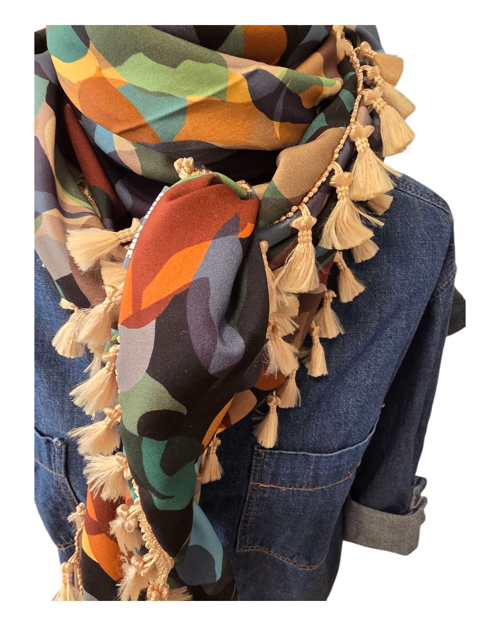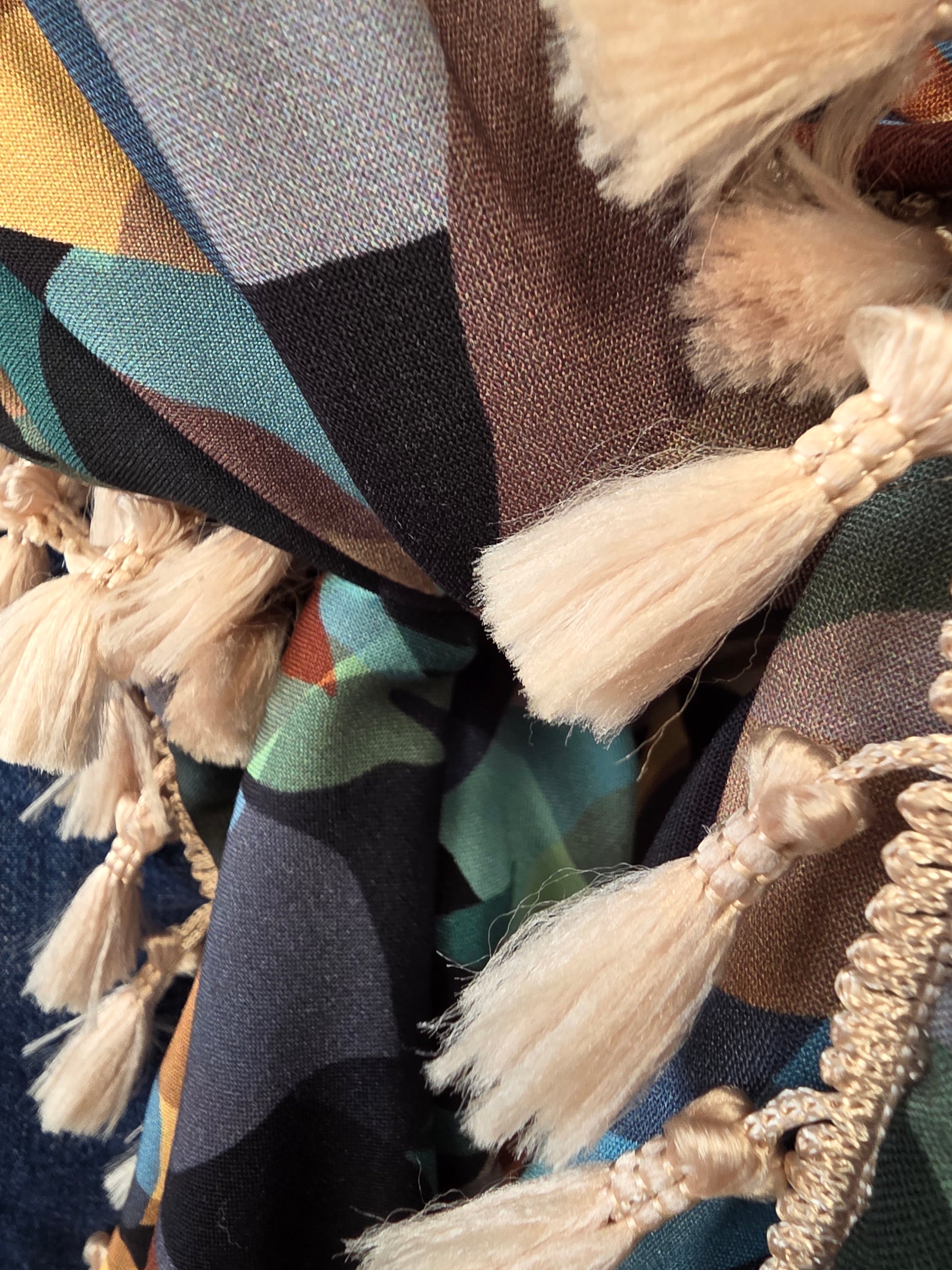 Dreieckstuch in 100 % Twill-Viskose. Blättermuster in schöne Herbstfarben. Der Schal ist sehr weich und fein, schmeichelt sich schön an Hals. Ein Hingucker. Quastenborte in Sand.