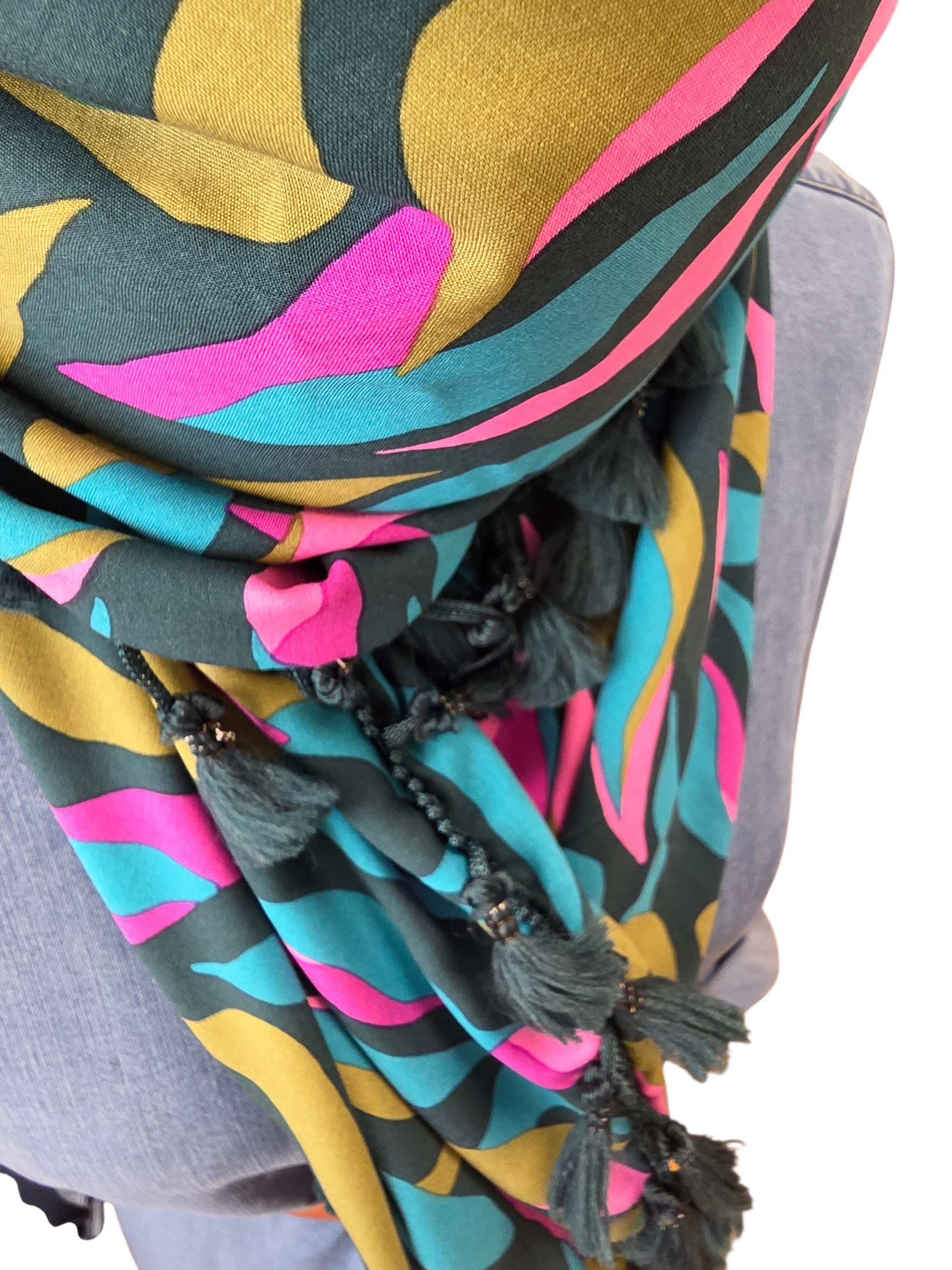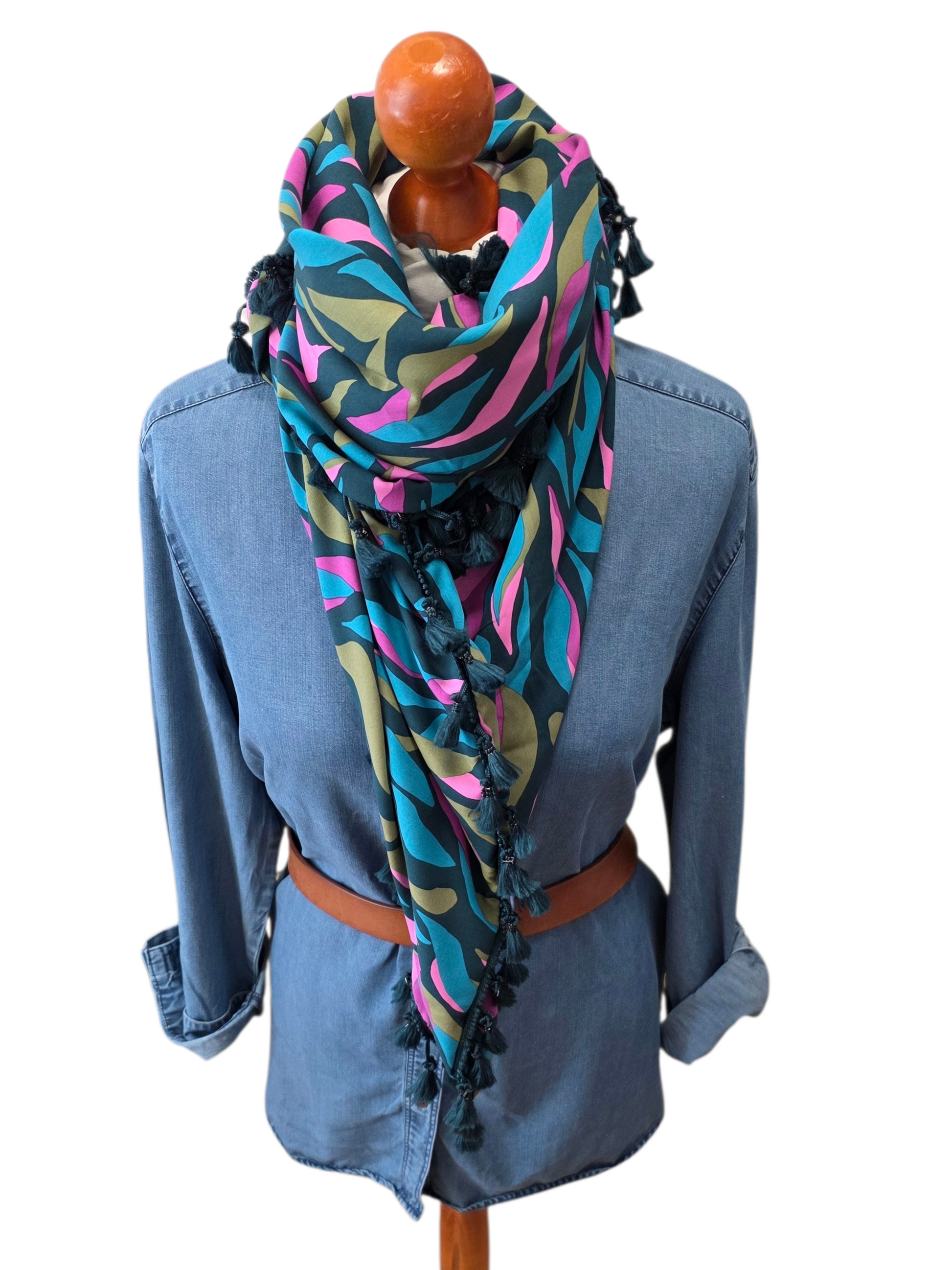 Das Dreieckstuch Damen Christelle besteht zu 100 % aus hochwertiger Viskose und ist doppelt genäht, was eine erhöhte Langlebigkeit gewährleistet. Die harmonische Farbkombination aus Pink, Olivgrün, Petrolgrün und Türkis verleiht dem Schal ein frisches, frühlingshaftes Erscheinungsbild, ideal für vielseitige Stylingoptionen. Quastenborte in Petrolgrün.