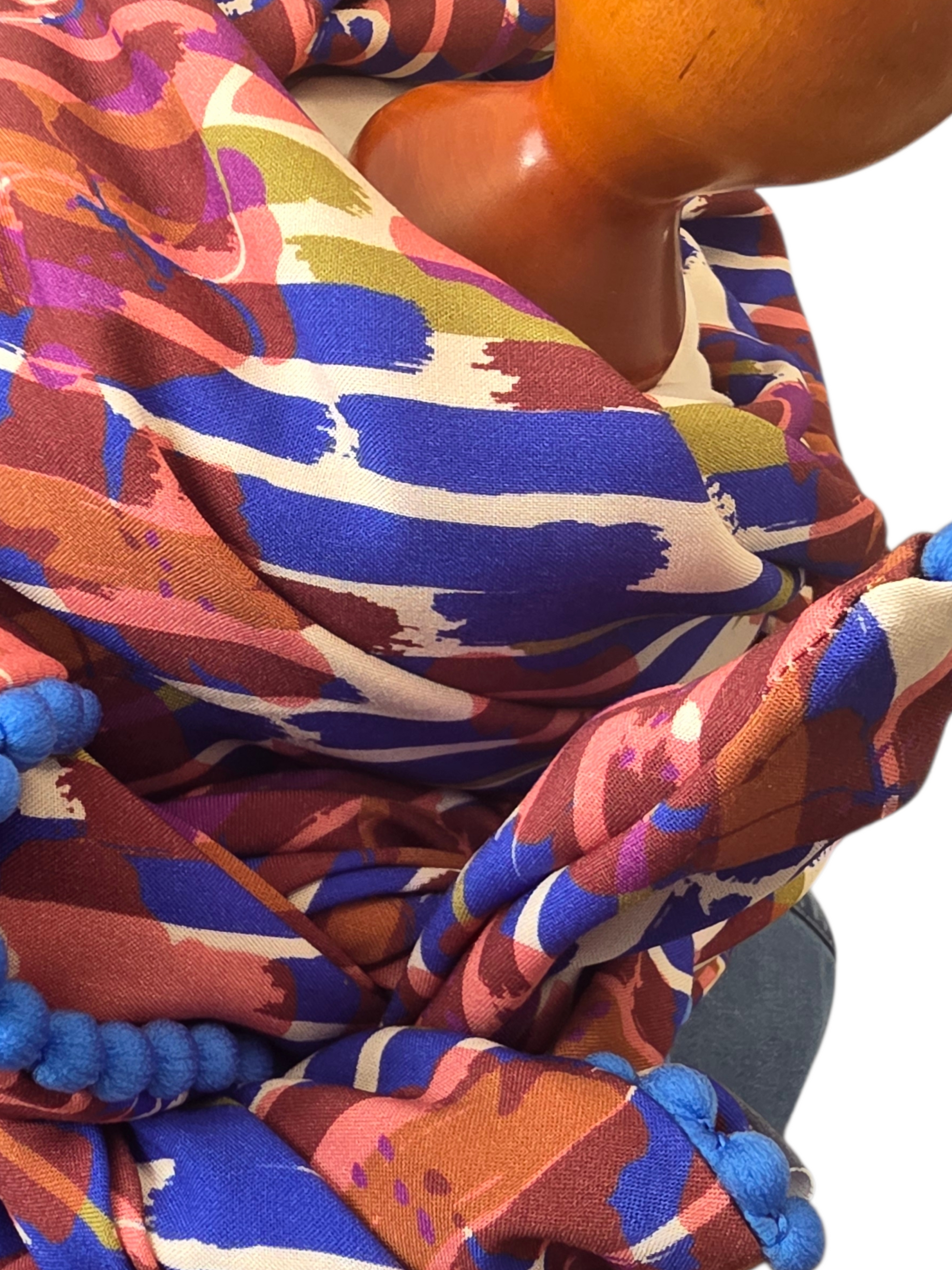 Das Dreieckstuch Damen Siria kombiniert stilvolle Farben wie royalblau, braun, offwhite, grün und peach mit einem eleganten abstrakten Blumenmuster. Der feine Viskosestoff bietet einen angenehmen Tragekomfort, während die doppeltgenähte Borte Stabilität gewährleistet. Ideal für vielseitige Outfits.