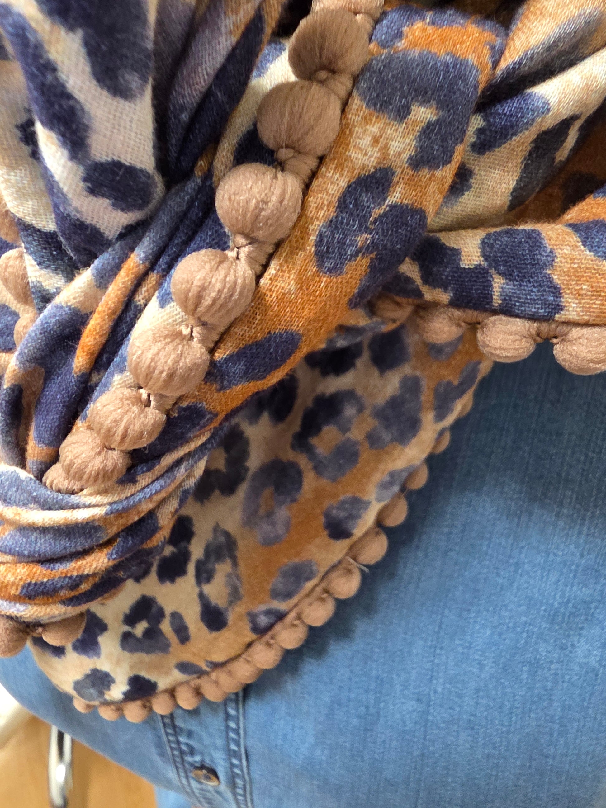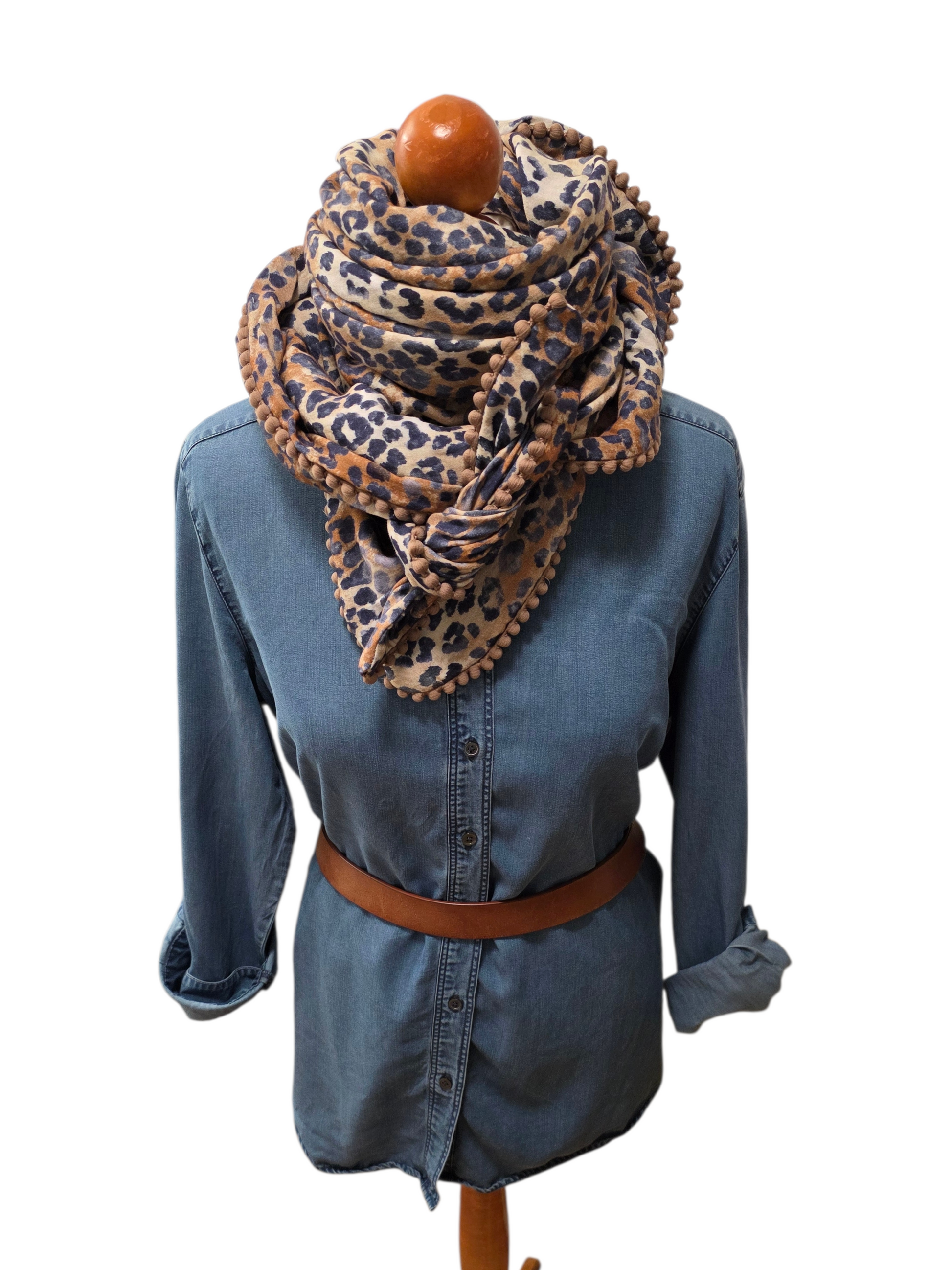 Musselintuch in 100% Baumwolle in tollen Leomuster in verschiedenen Brauntöne und Blau, und mit Borte in hellbraun.