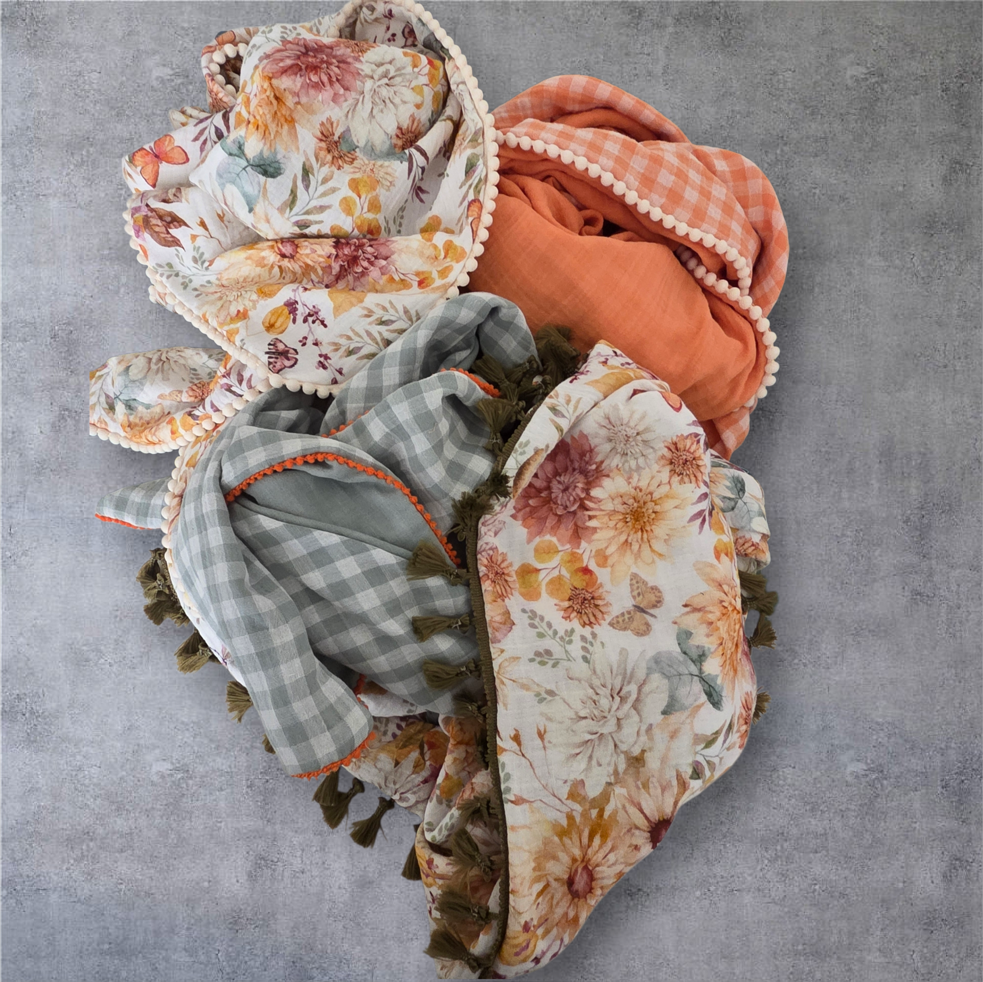 Zartes Musselintuch Sylvie mit zauberhaften Blüten, Schmetterlingen und Libellen in sanften Herbsttönen. Das Dreieckstuch schmiegt sich angenehm an die Schultern und bietet vielseitige Styling-Möglichkeiten. Die feine Musselin-Qualität garantiert höchsten Tragekomfort und Atmungsaktivität. Ein Accessoire für jeden Tag, das Ihre Garderobe mit natürlicher Schönheit bereichert. Borten in Offwhite