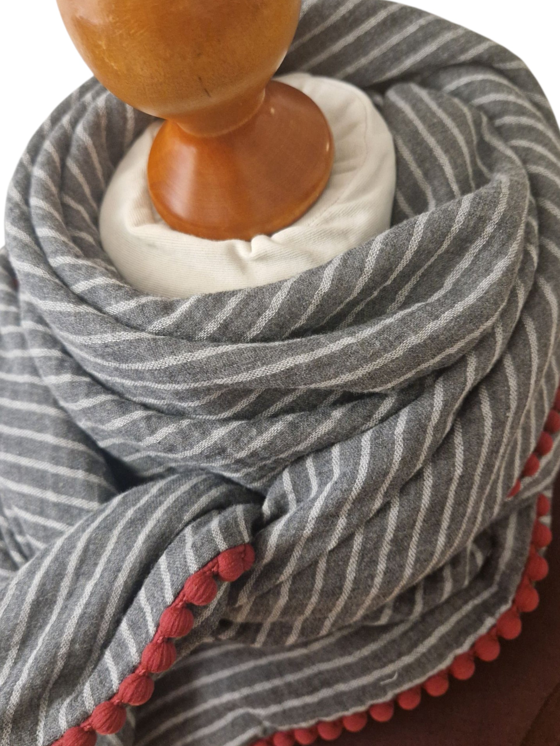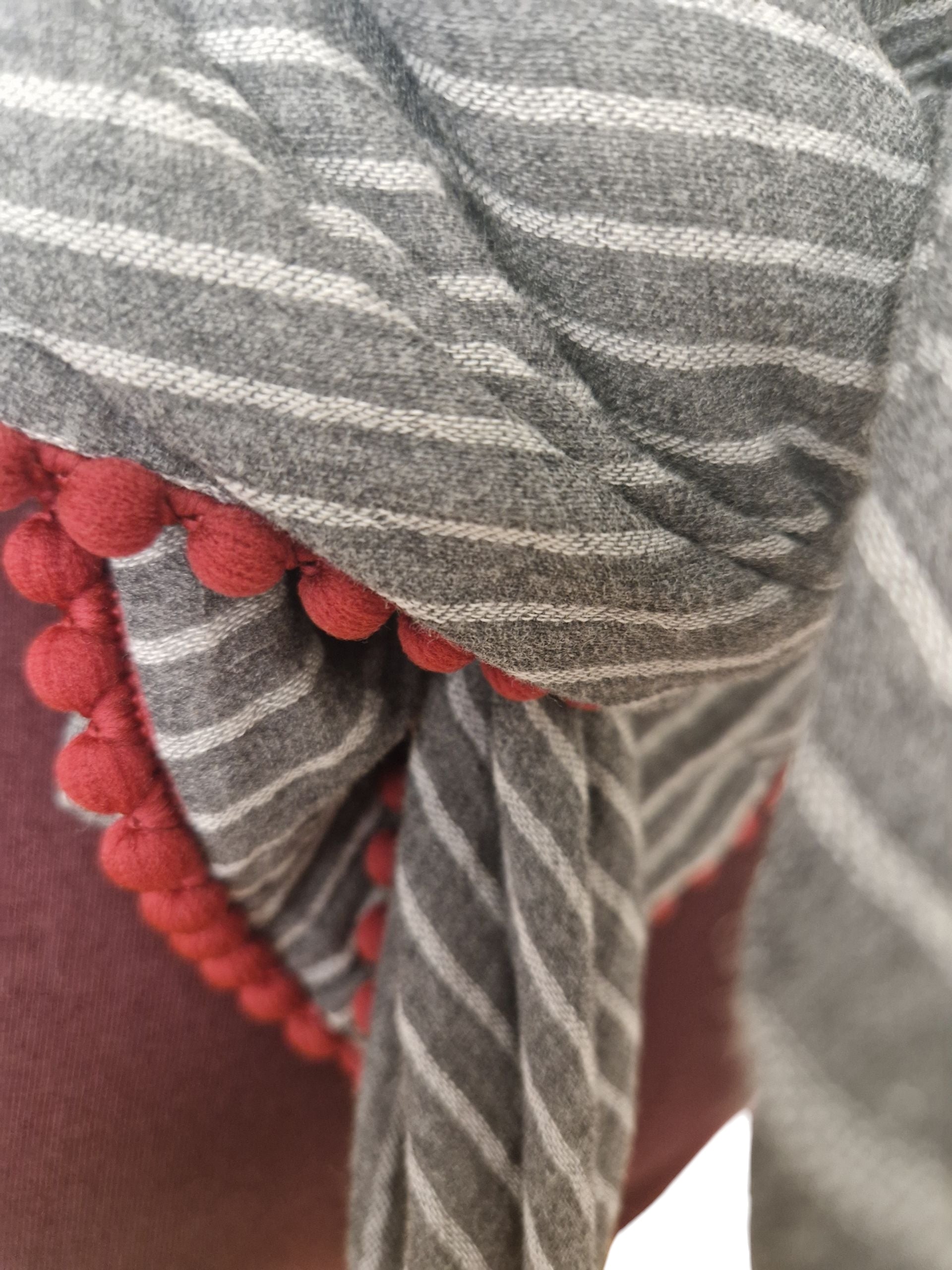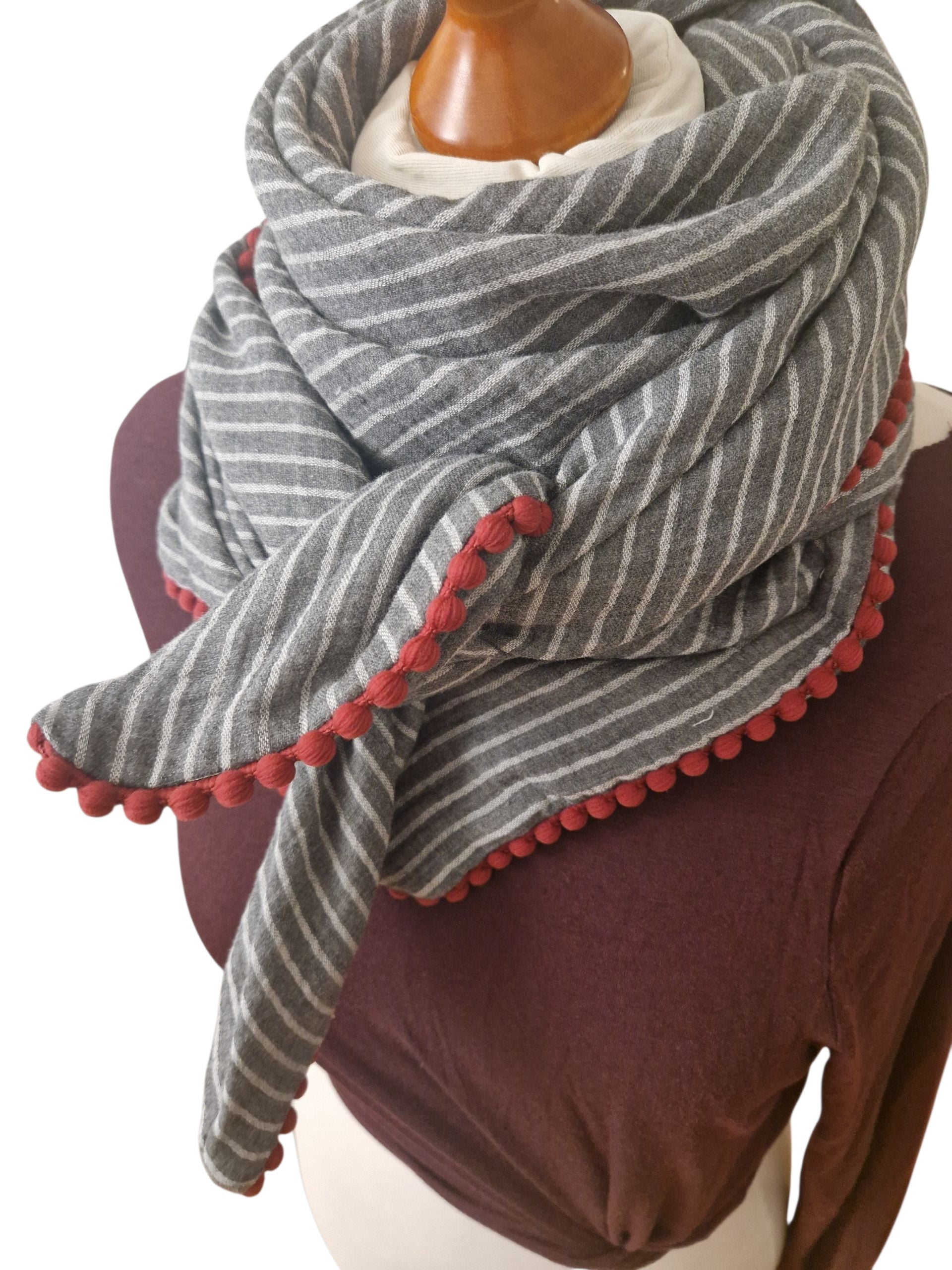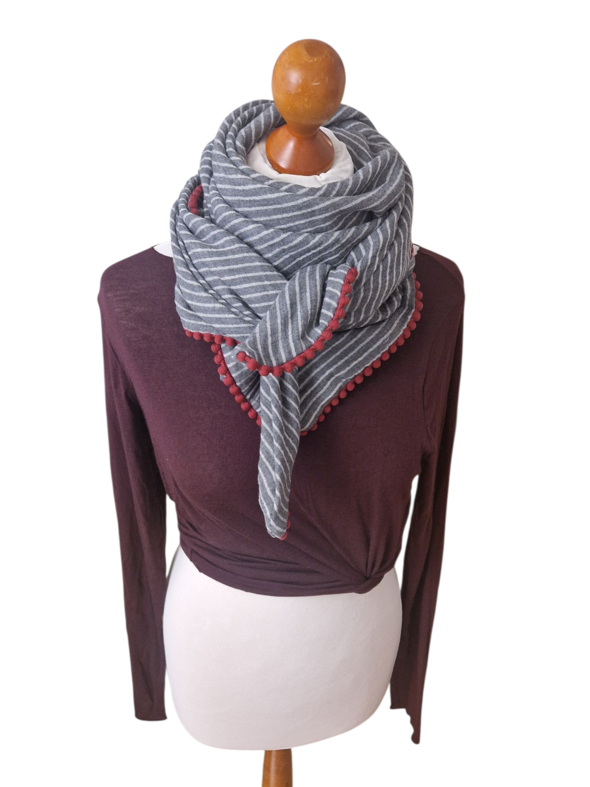 Wunderschöner Dreieckstuch in 100% Musselinstoff, Baumwolle 100% . Doppeltgenäht. Streifenmuster, schwarz-hellgrau. Extrem weich und leicht. Borte in Bordeaux.