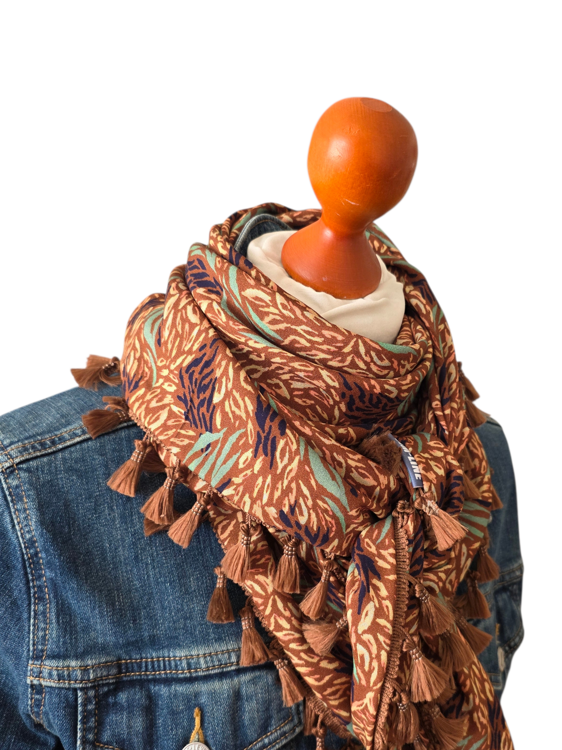 Das Dreieckstuch Damen Flavia besteht aus 100 % Viskosestoff, der leicht und weich fällt. Die harmonischen Brauntöne gepaart mit den frischen Mint- und Peach-Farben bieten eine elegante Optik. Vielseitige Kombinationen in Ihrer Garderobe. Quastenborte in braun