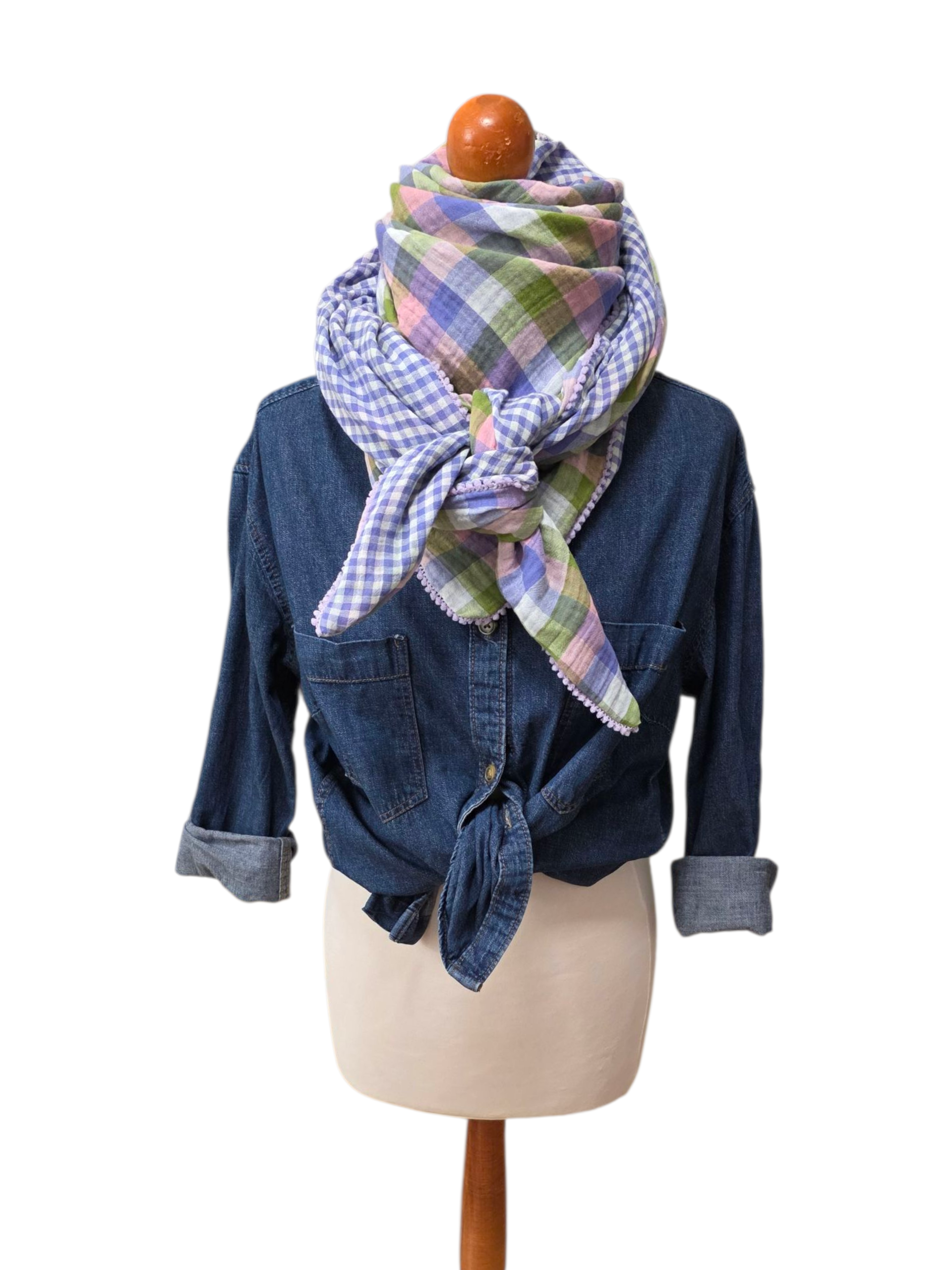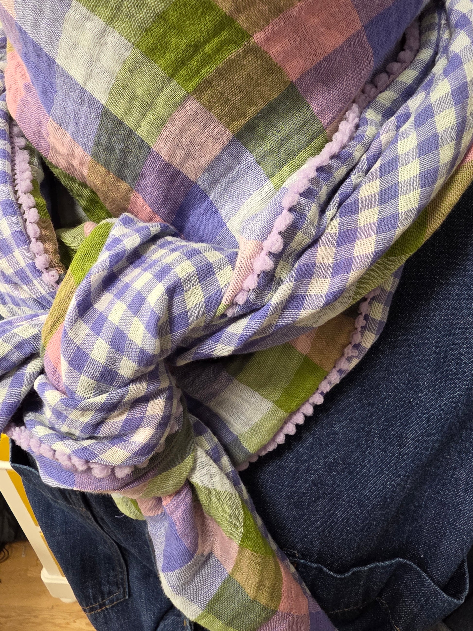Das Dreieckstuch Iva ist ein Musselinschal aus 100 % Baumwolle in Rosa, Olivgrün und Lila mit einem schönen Karomuster. Die eine Seite ist mit farbigen, größeren Karos versehen, während die andere Seite mit kleinen Karos verziert ist. Genießen Sie das schöne Musterspiel und halten Sie sich dabei warm und stylisch. Kleine, feine Borte in Lila.